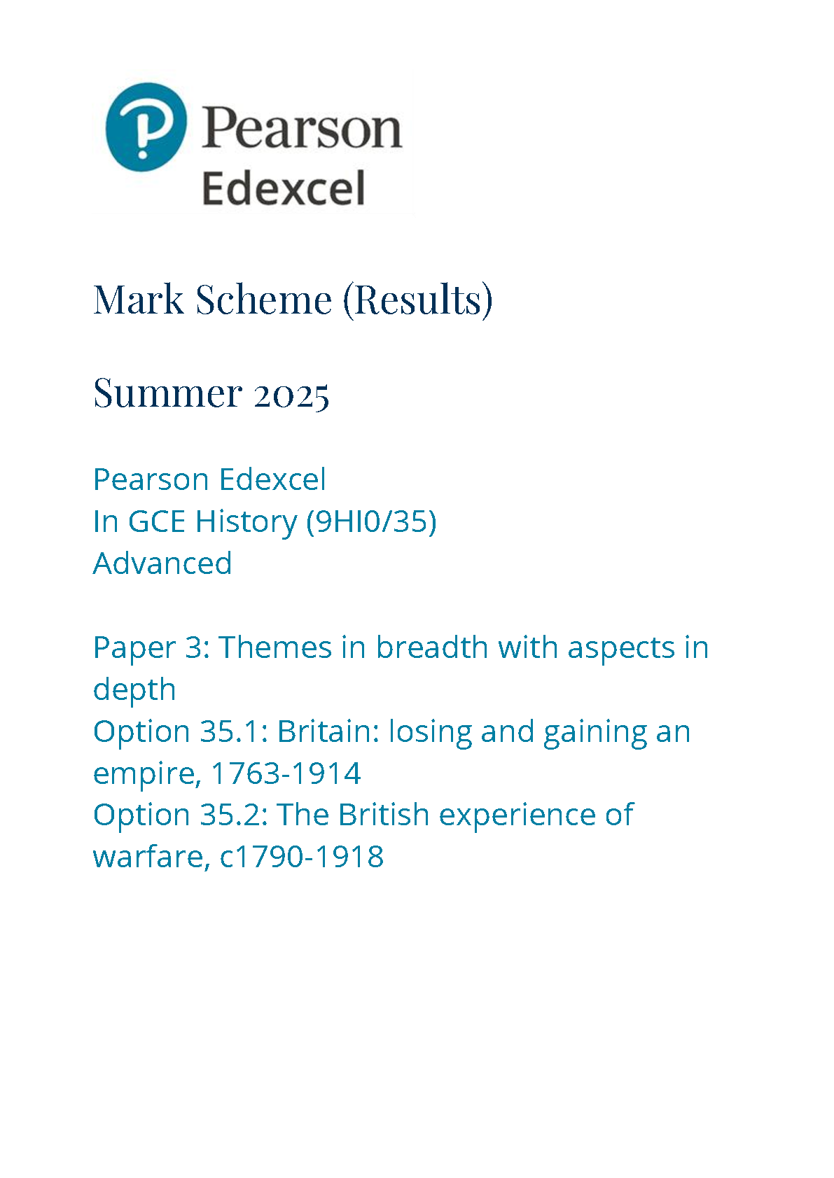 2025 Pearson Edexcel A Level History Mark Scheme Paper 3 (9HI0/35: Themes in breadth with aspects in depth)