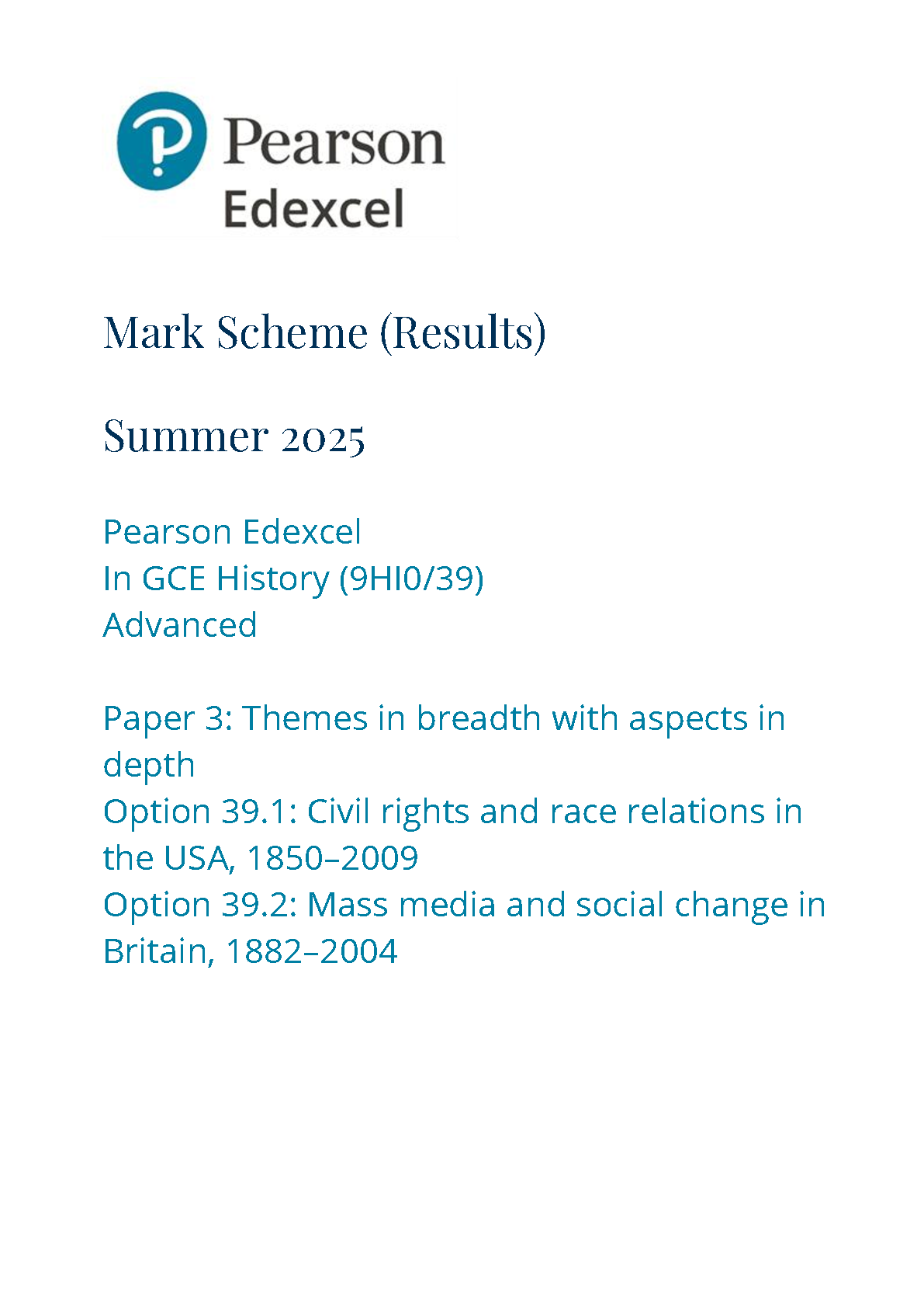 2025 Pearson Edexcel A Level History Mark Scheme Paper 3 (9HI0/39: Themes in breadth with aspects in depth)