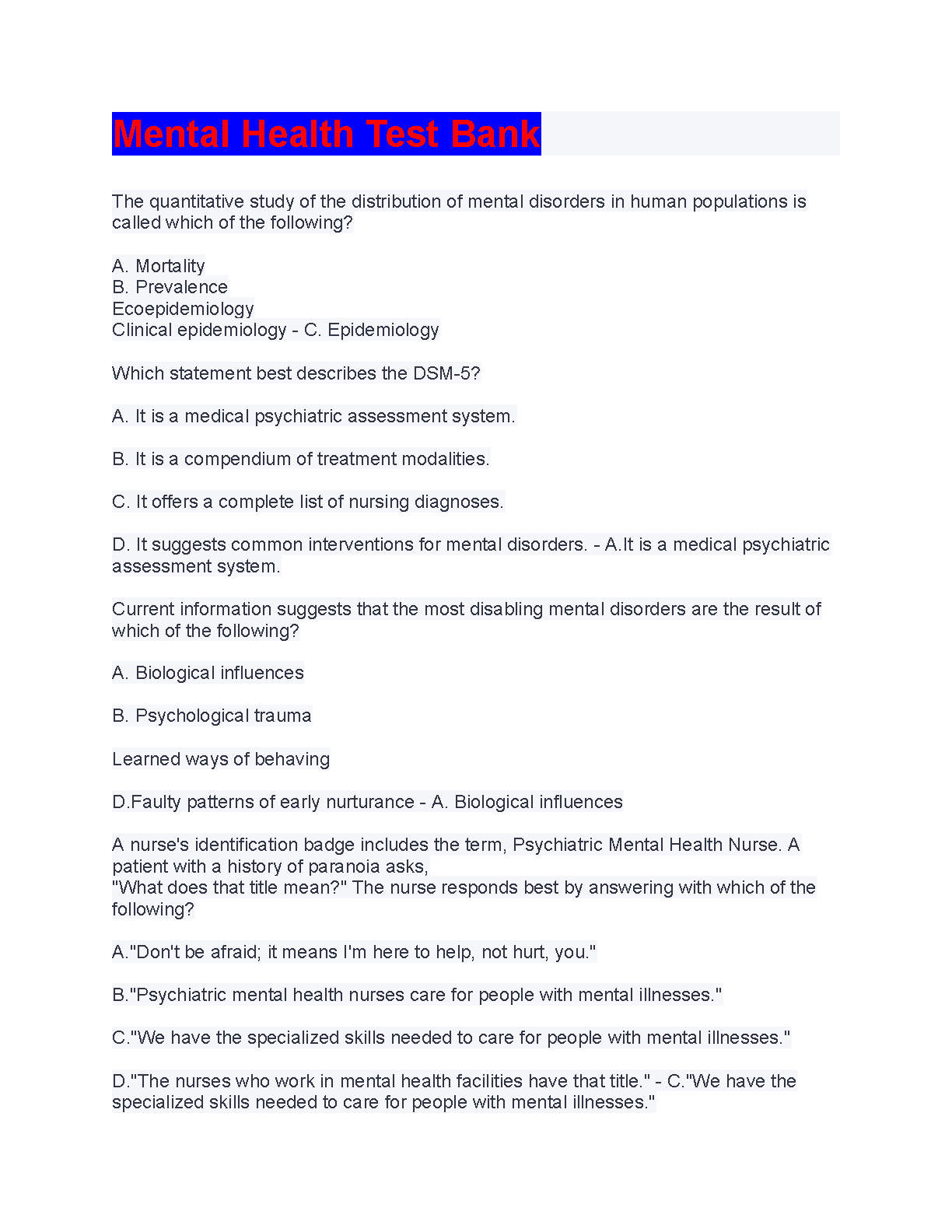 TEST BANK FOR Mental Health. QUESTIONS AND ANSWERS 2023/2024