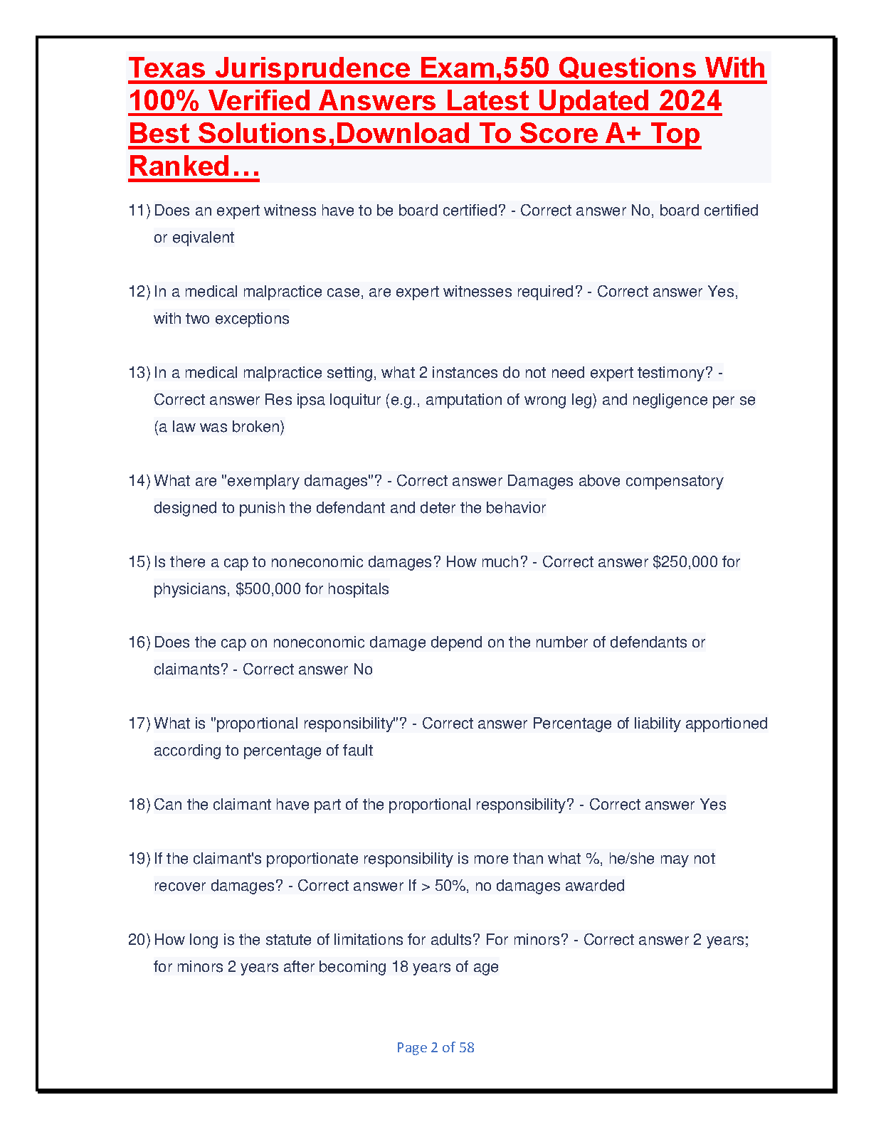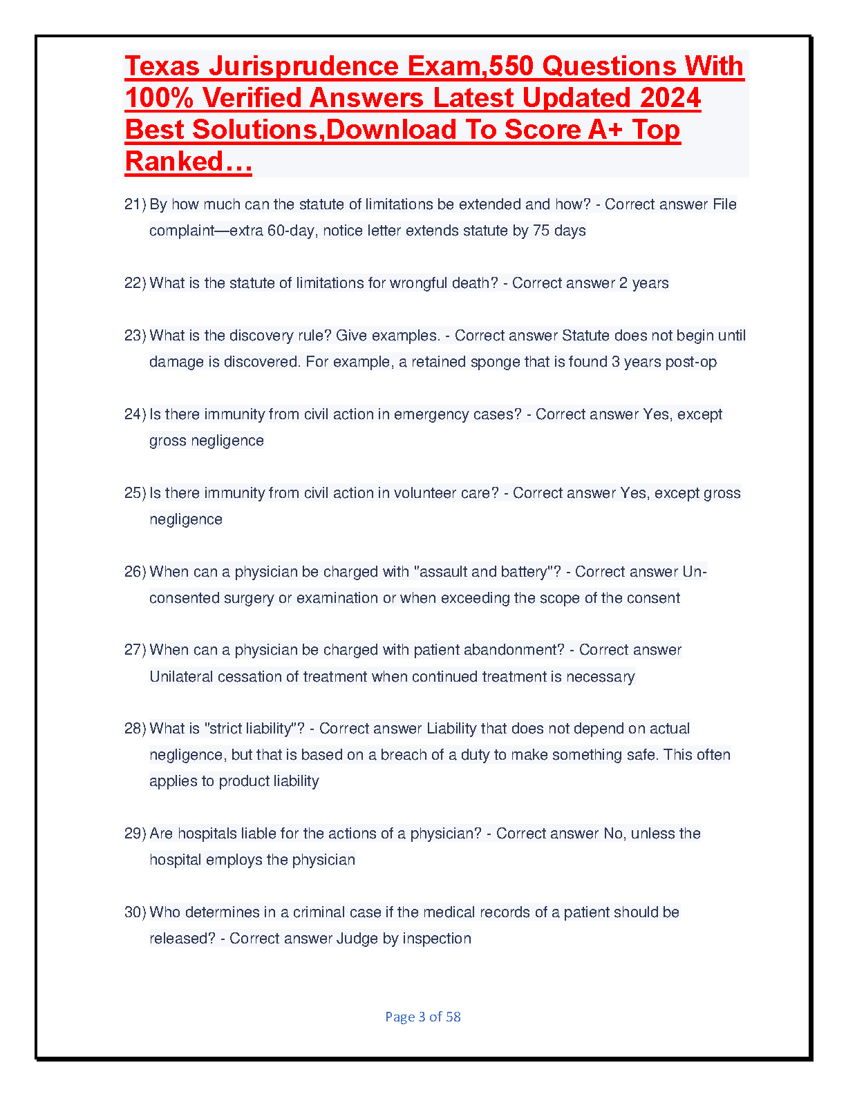 Ace the Texas Jurisprudence Exam on your first try with our comprehensive test bank for the 2024/2025 licensing period. This top-ranked resource features an extensive collection of over 550 practice questions, each with a 100% verified and correct answer. Designed to cover all essential topics from the Texas Medical Practice Act, this study guide provides the best solutions to help you master the material, build confidence, and achieve an A+ score. Download now to ensure you pass your exam without the need for resits.