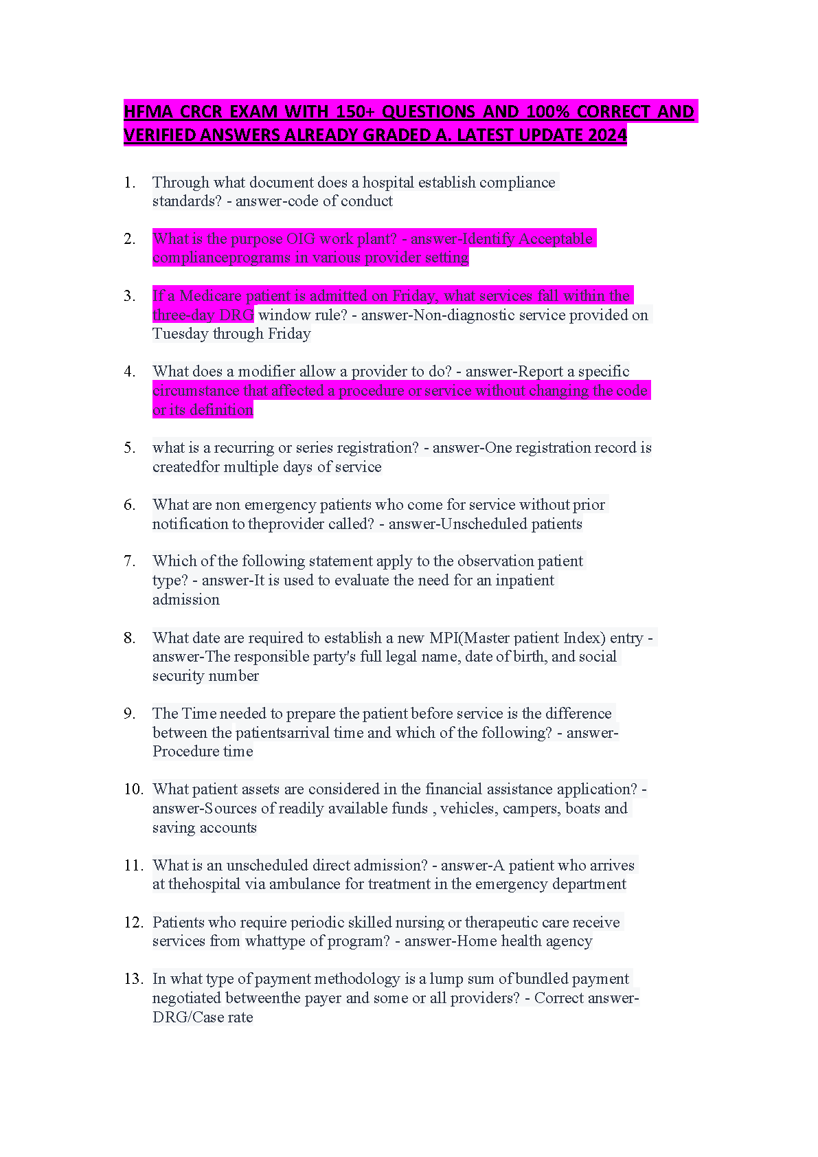 HFMA CRCR Certification Exam Prep 2024 Test Bank - Q&A with 150+ Verified Questions, Graded A