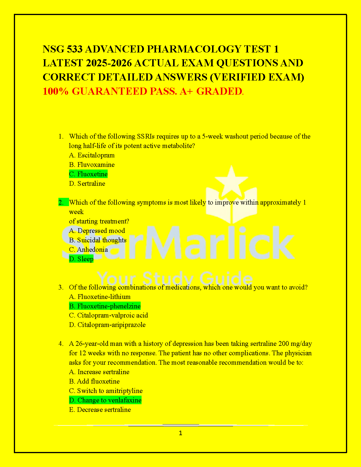 Unlock A+ results in your NSG 533 Advanced Pharmacology course with our premier Test 1 study guide for the 2025-2026 academic year. This essential resource features a complete collection of the latest, verified exam questions, each paired with correct, in-depth answers. Designed to mirror the actual test, this guide will help you grasp critical topics in advanced pharmacology, boost your confidence, and secure a top grade. Prepare efficiently, avoid resits, and guarantee your success on the first try with this expertly compiled exam bank.