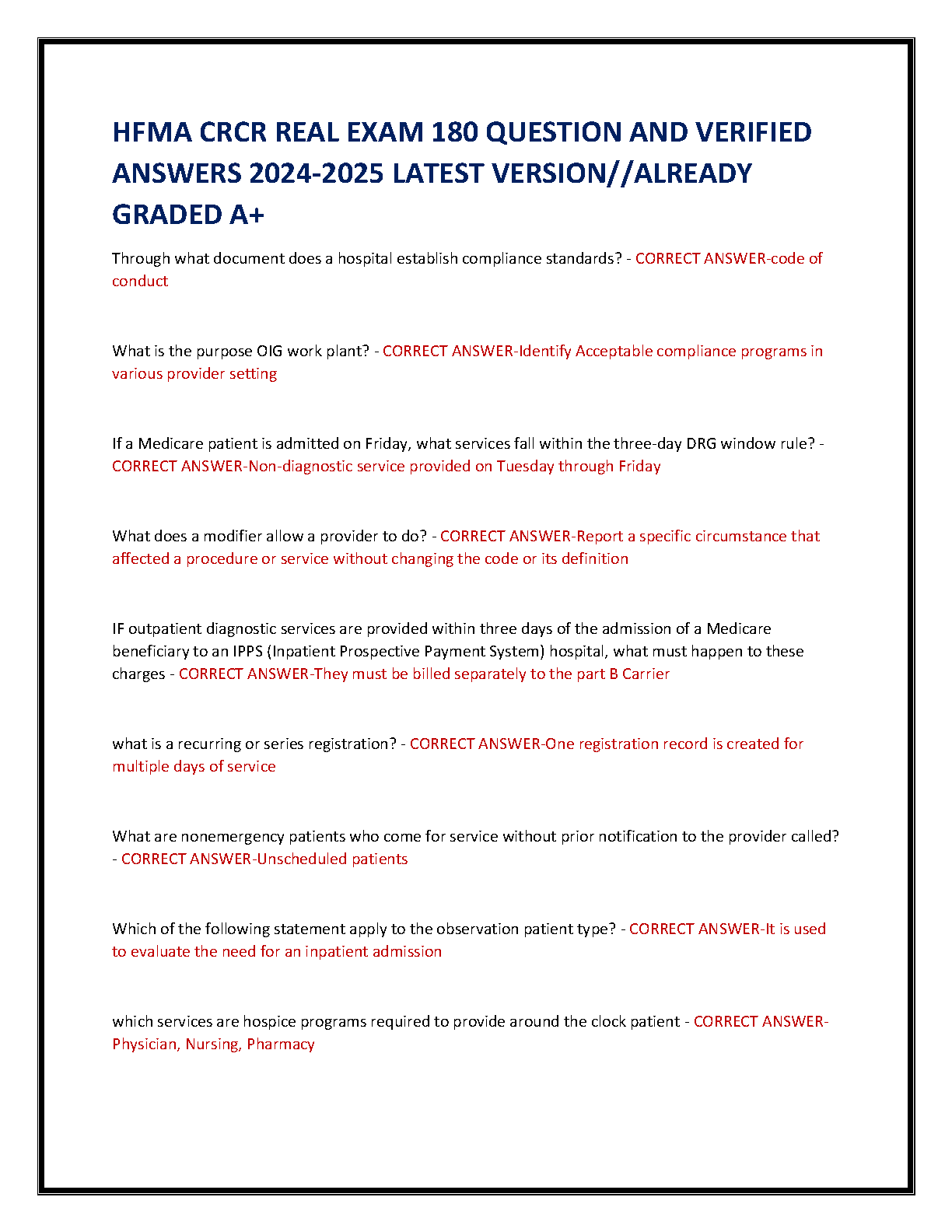 HFMA CRCR Exam Test Bank 2024-2025 Edition | 180 Questions & Verified Answers for A+ Grade Success
