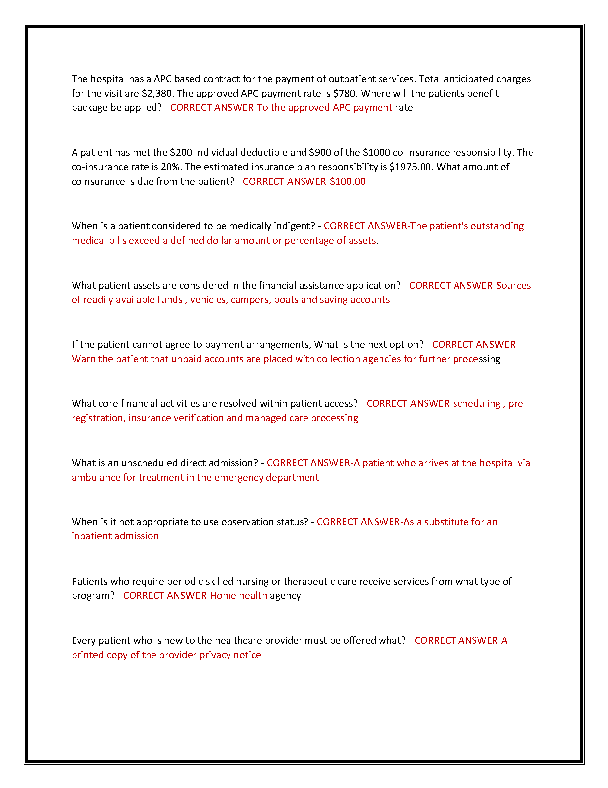 Prepare to excel in your Healthcare Financial Management Association (HFMA) Certified Revenue Cycle Representative (CRCR) exam with our premier test bank for 2024-2025. This guide is meticulously compiled with 180 authentic exam questions and their verified, A+ graded answers. Master key concepts such as compliance, Medicare regulations, billing procedures, and patient services. This essential study tool is designed to provide you with the knowledge and confidence needed to pass your CRCR certification exam on your very first attempt. Unlock your A+ potential and advance your career in healthcare finance today!