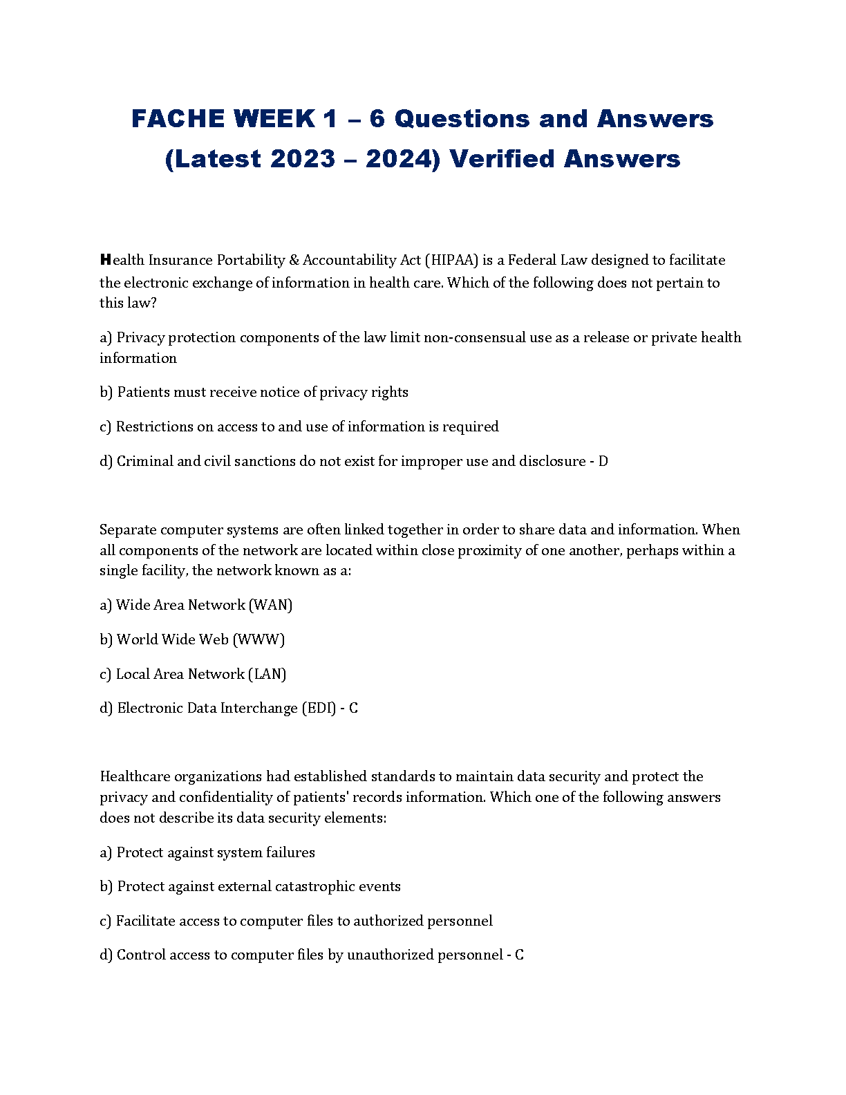 Ace your FACHE certification exam with our comprehensive Week 1 Test Bank, fully updated for the 2025/2026 academic year. This downloadable resource features a complete set of questions and 100% verified answers, covering essential topics such as the Health Insurance Portability & Accountability Act (HIPAA), healthcare network infrastructures, and critical data security standards. Designed specifically to help you master the core concepts and pass your exam on the first attempt, this study guide is your key to avoiding resits and advancing your career in healthcare leadership.