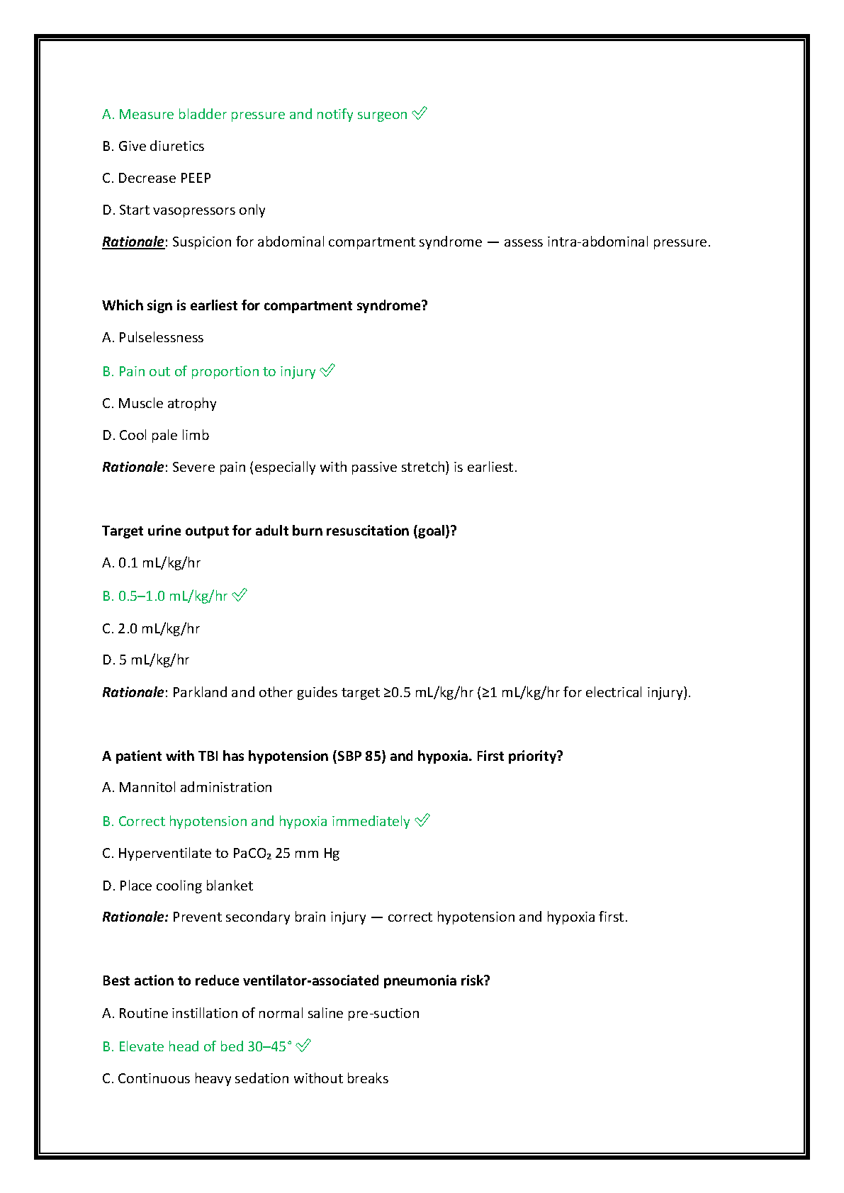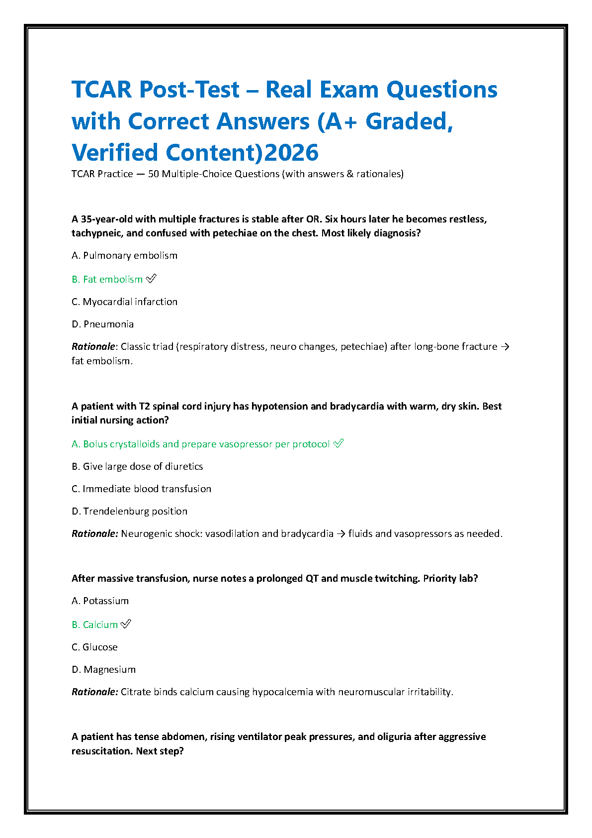 Ace your Trauma Care After Resuscitation (TCAR) certification with this comprehensive post-test exam bank for the 8th Edition! This A+ graded resource, updated for 2026, provides 50 real exam-style multiple-choice questions, each complete with a verified correct answer and a detailed rationale. This study guide is expertly designed to cover critical trauma care concepts, helping you master the material, build confidence, and pass your TCAR exam on the very first attempt. Avoid the stress of resits by studying with these targeted, high-yield questions that mirror the actual certification test.