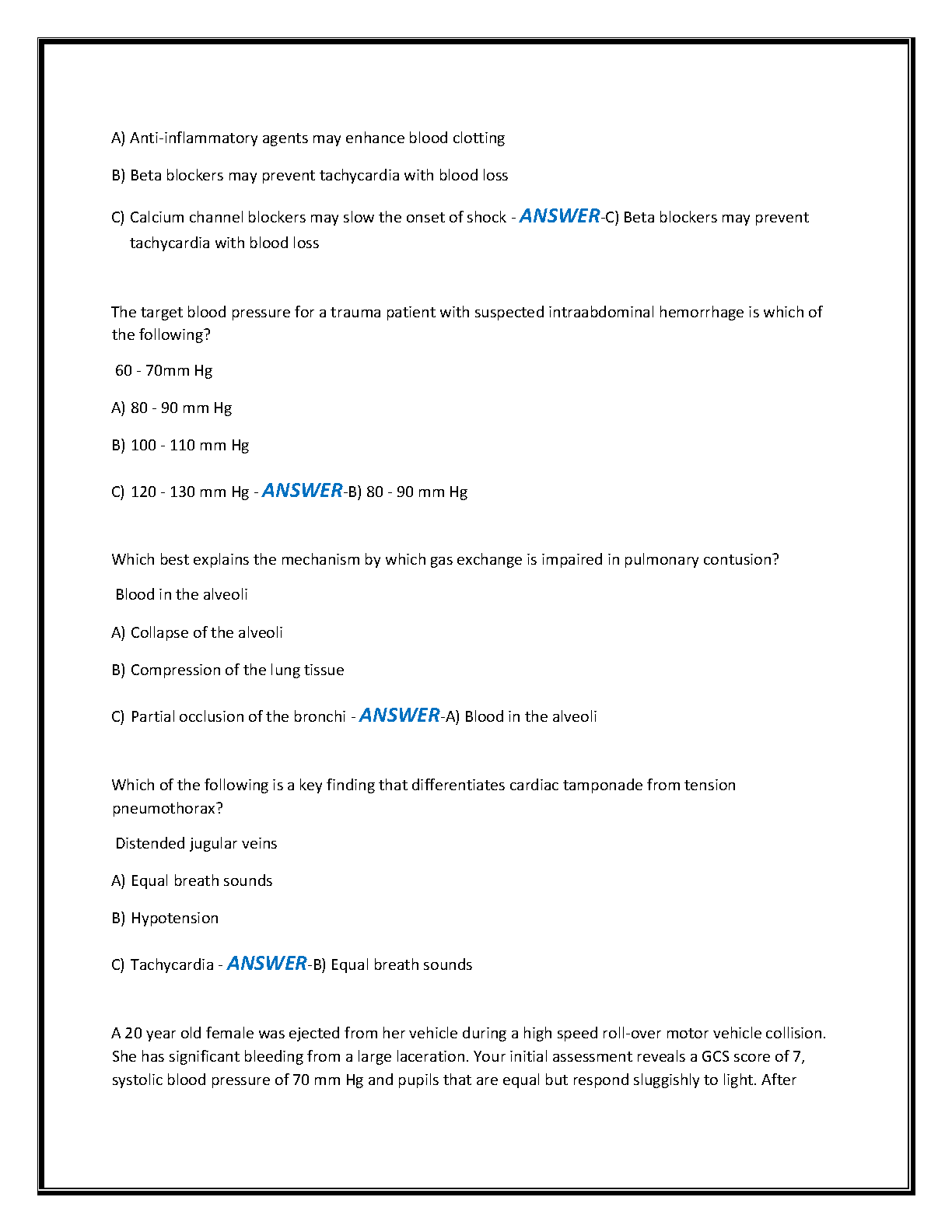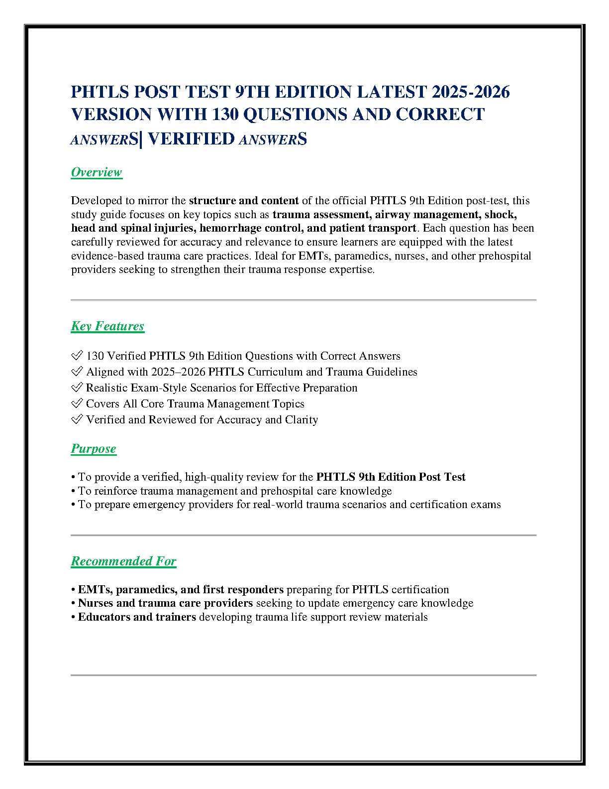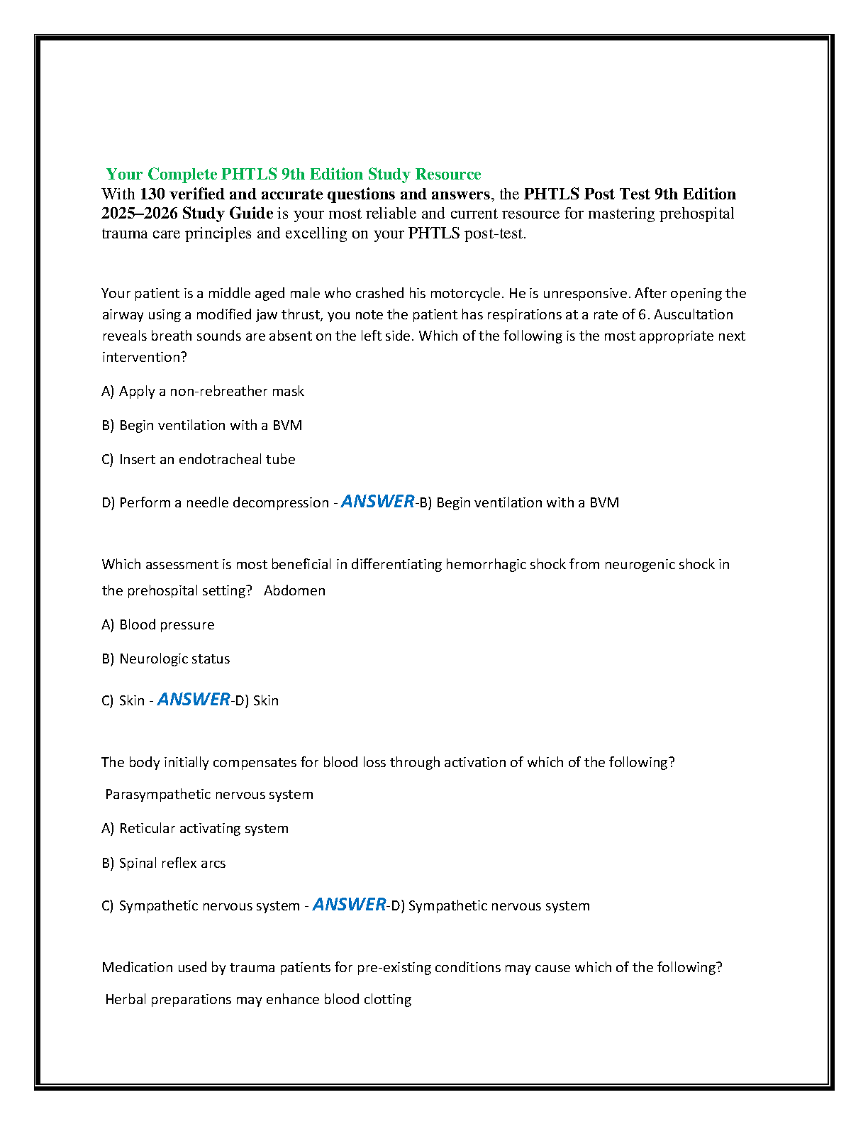 Master your PHTLS certification exam with confidence using the ultimate study resource for the 9th Edition of Prehospital Trauma Life Support by NAEMT. This newly released 2025-2026 Post-Test Bank is expertly crafted to help you pass on your first attempt and avoid resits. It includes 130 verified, exam-style questions with detailed, correct answers that cover all core trauma management topics. Deepen your understanding of trauma assessment, airway management, shock, hemorrhage control, and patient transport. Fully aligned with the latest PHTLS curriculum and guidelines, this guide is essential for EMTs, paramedics, nurses, and first responders seeking to excel in their certification and strengthen their real-world trauma response skills.