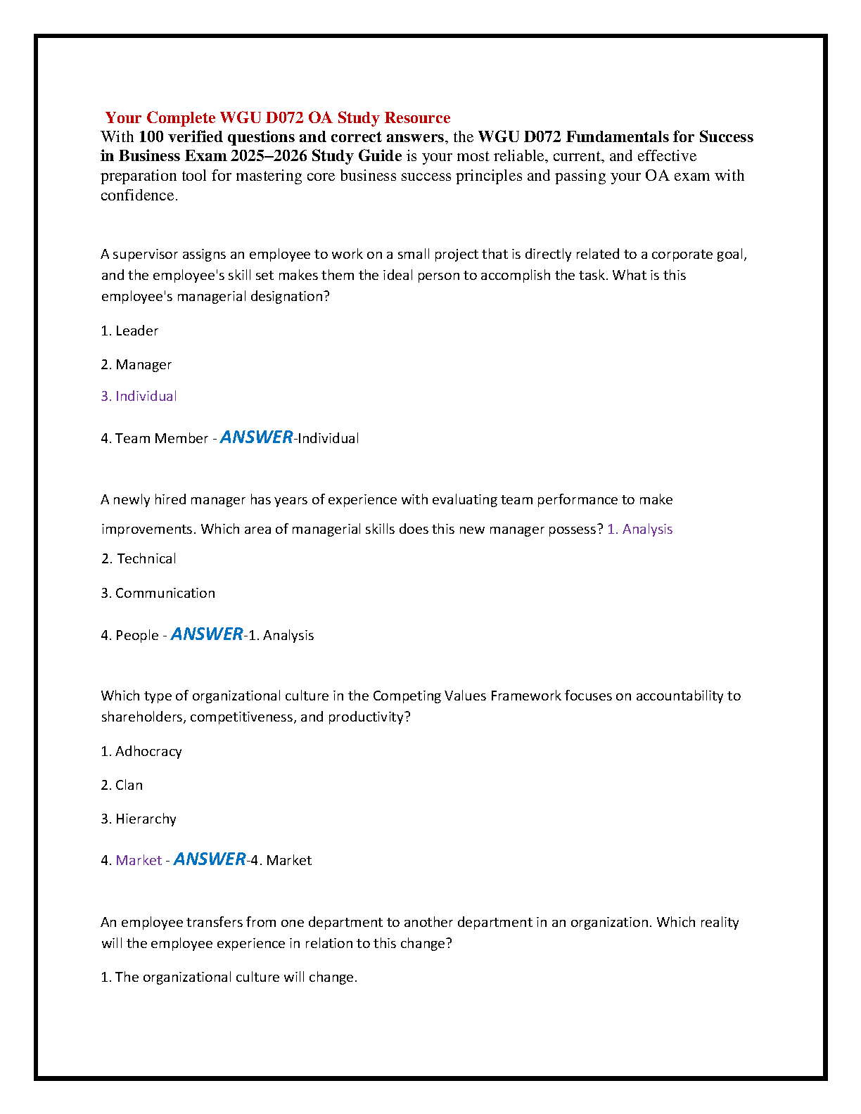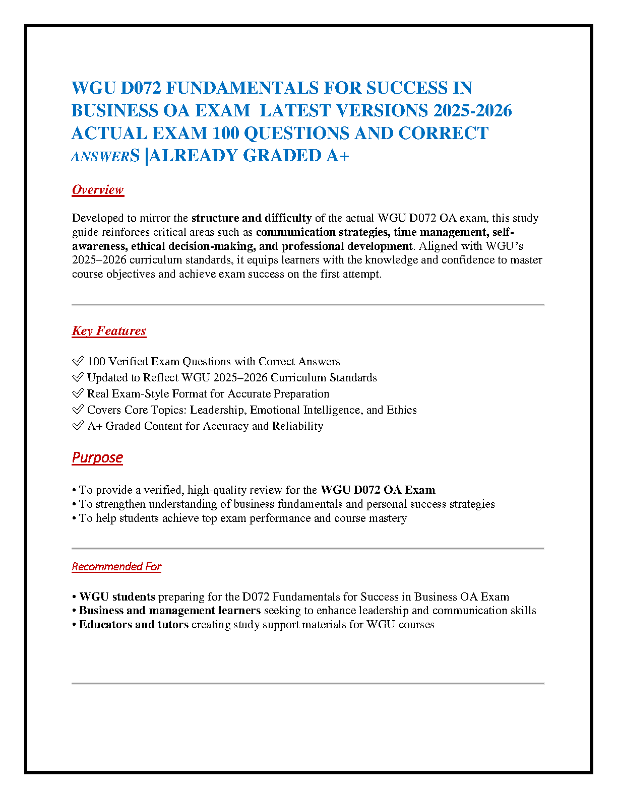 Master the WGU D072 Fundamentals for Success in Business OA exam on your first try with our comprehensive 2025-2026 test bank. This essential study guide features 100 verified, A+ graded questions and detailed correct answers, meticulously designed to mirror the actual exam's structure and difficulty. Reinforce your knowledge in critical areas including leadership, emotional intelligence, communication strategies, and ethical decision-making. Aligned with the latest WGU curriculum, this resource provides a real exam-style format to build your confidence and ensure you are fully prepared to pass without resits.