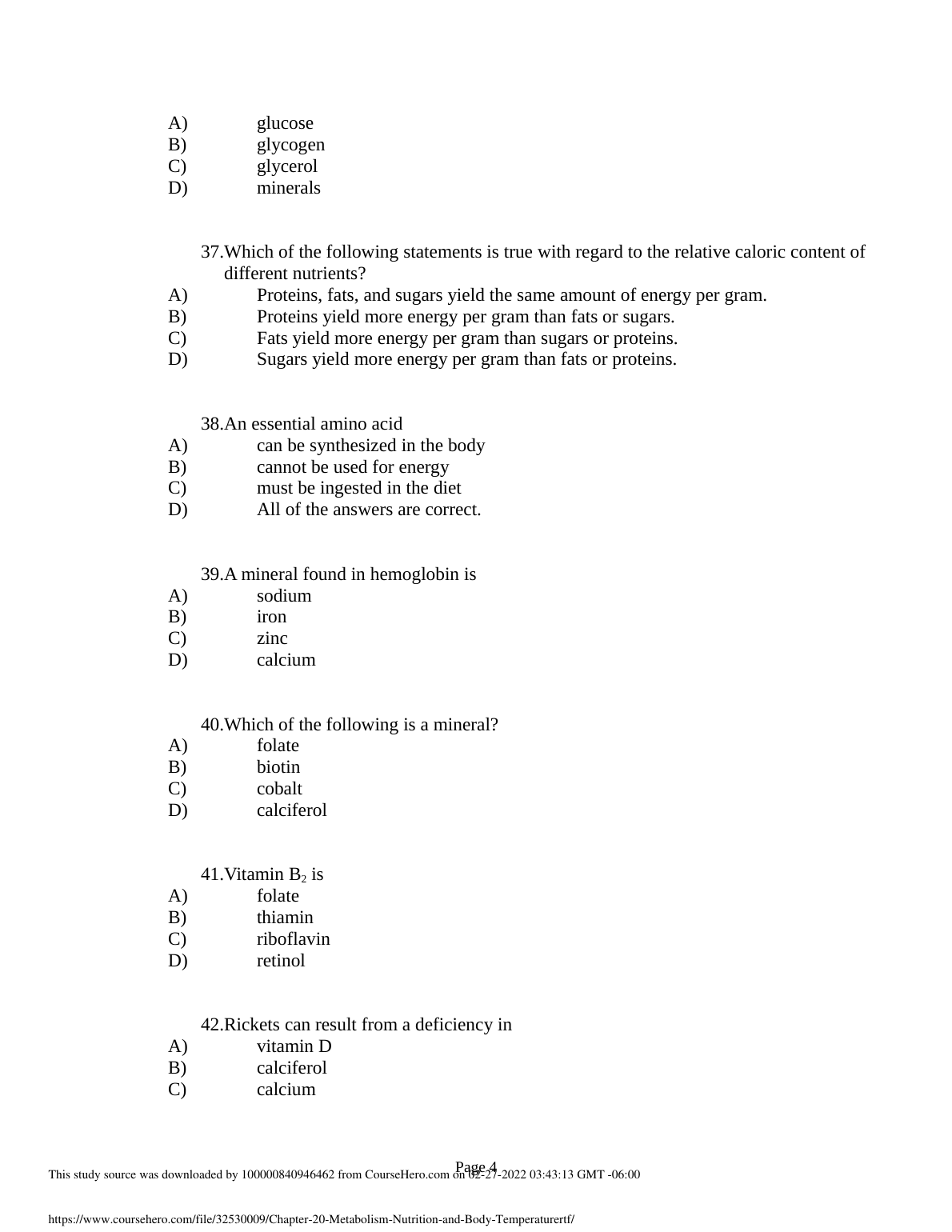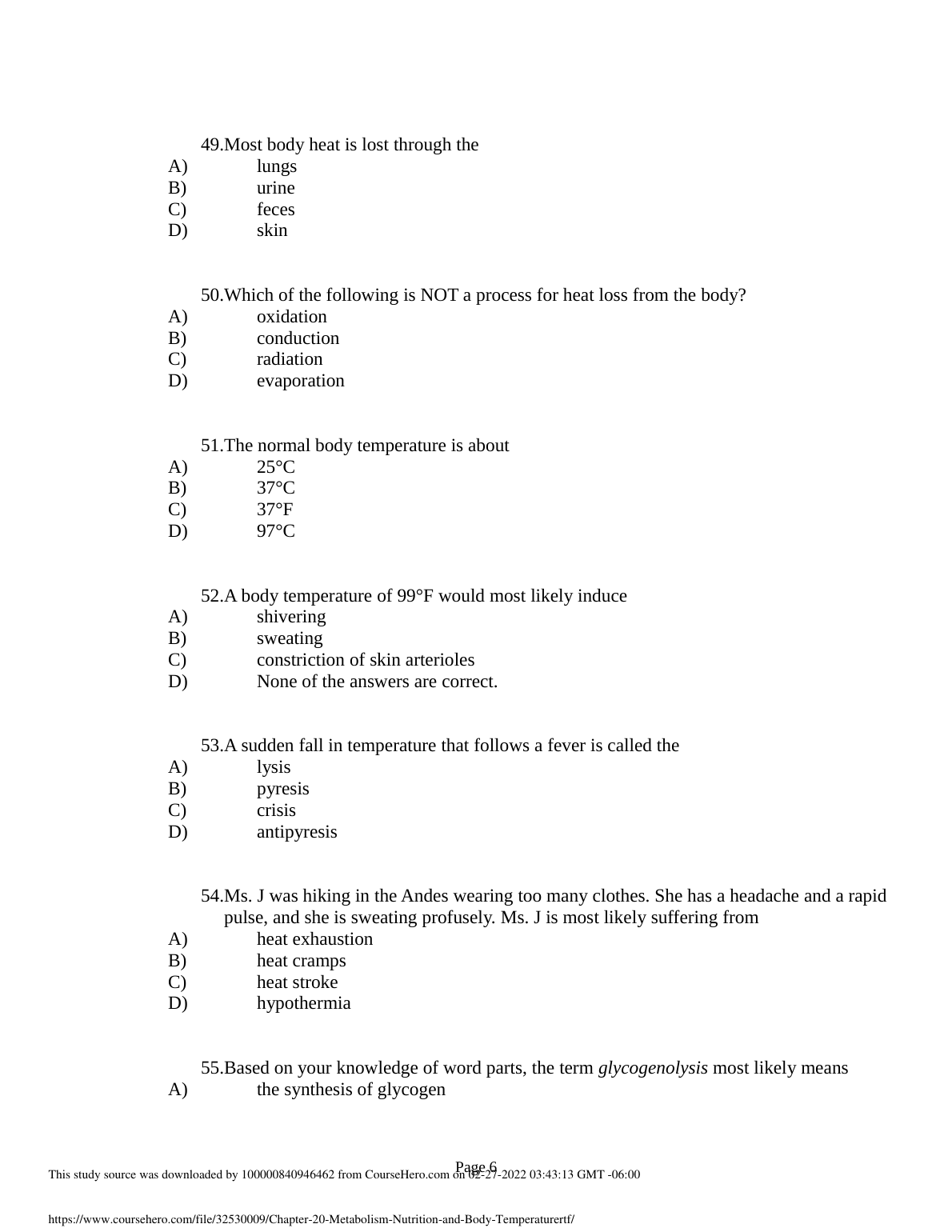 Test Bank For Chapter 20 Metabolism Nutrition and Body Temperature