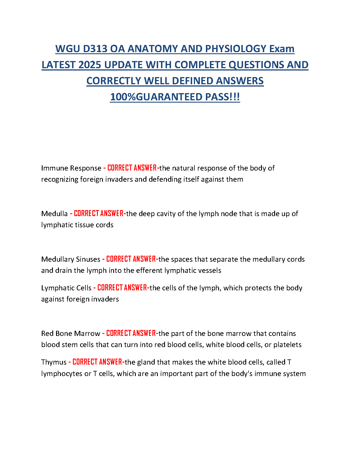 Ace your WGU D313 Anatomy and Physiology Objective Assessment with our meticulously crafted Test Bank, fully updated for the 2025-2026 academic year. This comprehensive resource is packed with a wide range of exam-style questions and detailed, 100% correct answers, covering all essential topics to ensure you're fully prepared. Say goodbye to exam stress and resits! Our study guide is designed to help you master complex concepts, from the immune response to the lymphatic system, and pass your OA on the very first try. Unlock your potential and secure your success in Anatomy and Physiology today!