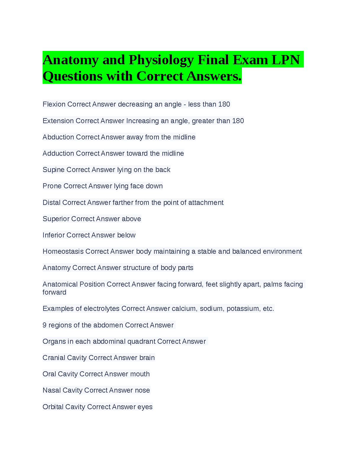 Struggling with Anatomy and Physiology? Our 2025/2026 LPN Final Exam Test Bank is your ultimate study companion. This resource provides a comprehensive collection of exam-style questions paired with 100% correct, verified answers. Master key concepts from anatomical positions and body cavities to homeostasis and cellular functions. Designed to help you study smarter, not harder, this test bank is your key to acing the final exam and passing on your first try. Download now and confidently prepare for your LPN A&P exam!