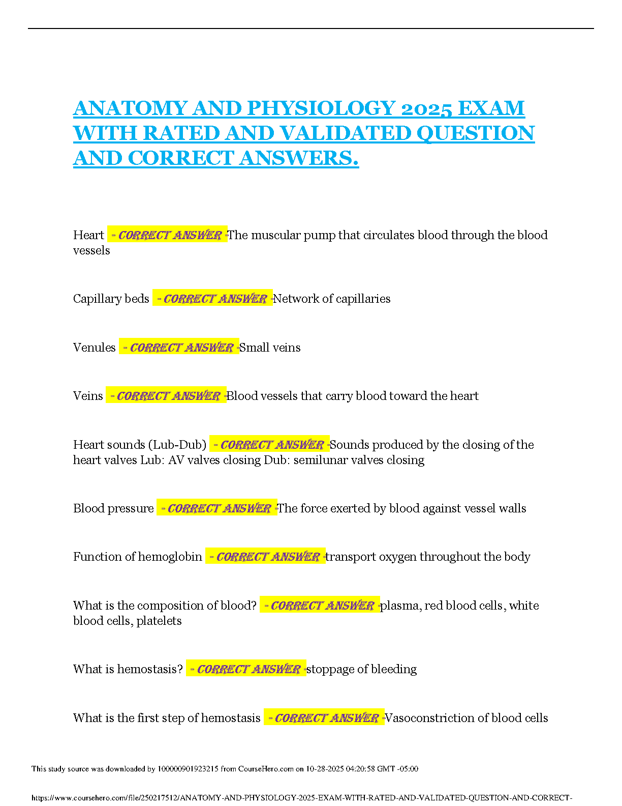 Unlock A+ results in your Anatomy and Physiology course with our latest 2025-2026 Test Bank. This comprehensive resource is packed with a wide range of rated and validated exam questions, each paired with a correct, verified answer. Designed to be your ultimate study partner, this guide helps you master complex topics, from the circulatory system to hemostasis, ensuring you're fully prepared. Stop cramming and start understanding. This test bank is the most effective tool to help you pass your exams on the first attempt, avoid resits, and build a solid foundation for your medical or nursing career.