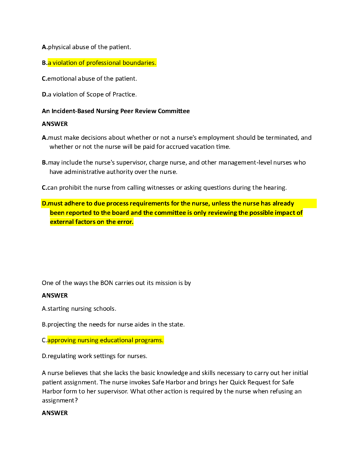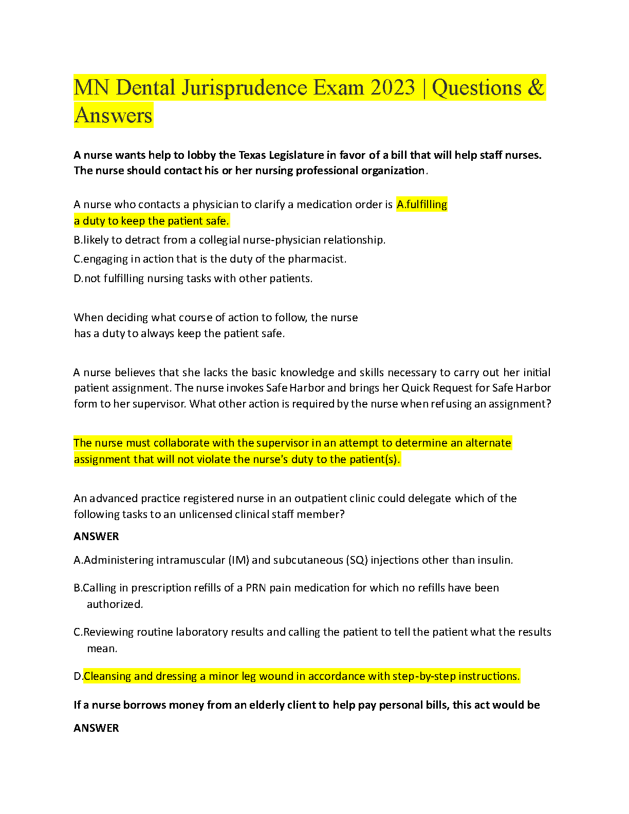 Ace your Texas Nursing Jurisprudence Exam with our comprehensive 2024/2025 test bank. This essential study guide features a complete set of verified questions and detailed answers, covering all critical topics you'll face on the exam. Master concepts like patient safety, professional ethics, scope of practice, and delegation rules, including Texas-specific provisions like Safe Harbor. Designed for a first-time pass, this resource provides the practice and confidence you need to succeed and secure your nursing license.