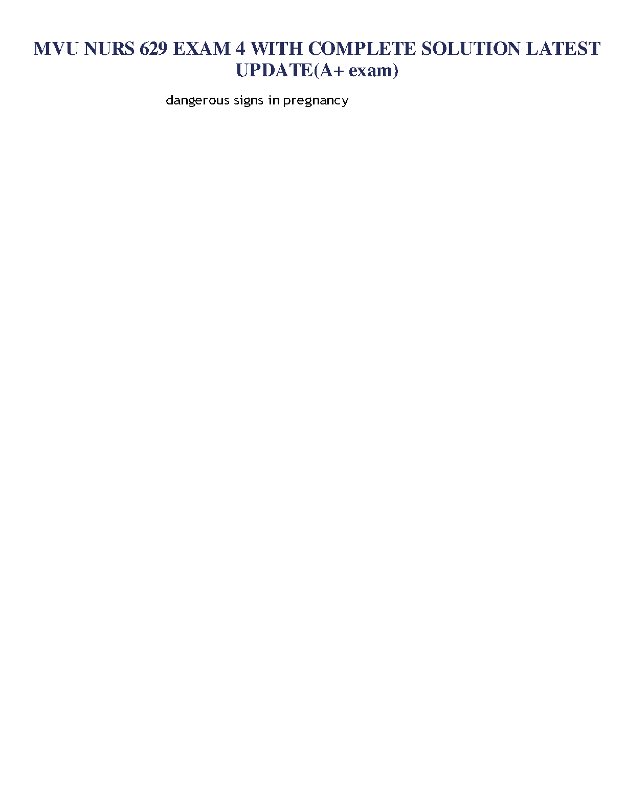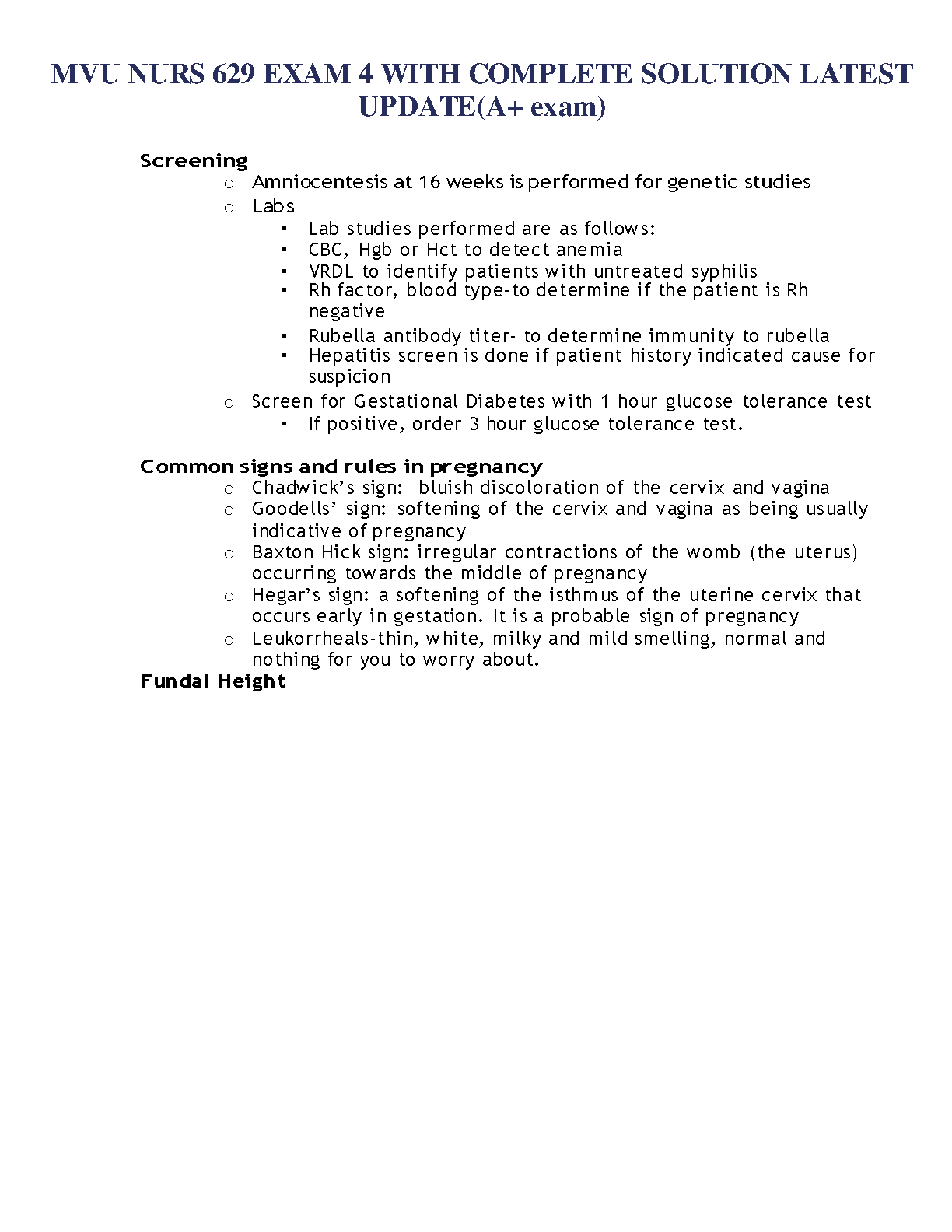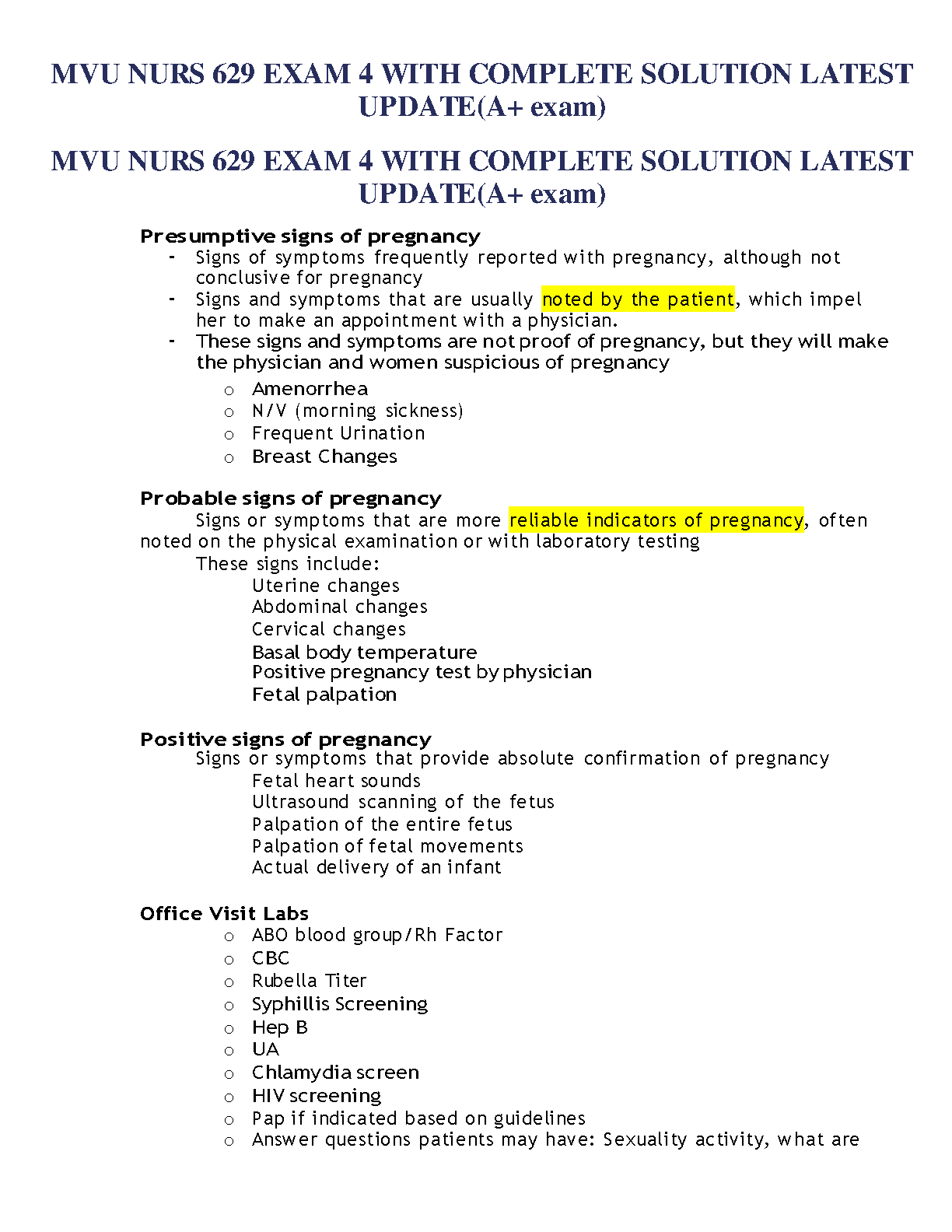 Ace your MVU NURS 629 Exam 4 with our comprehensive test bank, featuring complete and verified solutions. This latest 2025/2026 updated study guide provides in-depth coverage of all key topics, including presumptive, probable, and positive signs of pregnancy, and essential office visit lab procedures. Designed to help you master the material and achieve an A+ grade, this resource is your ultimate tool for passing on the first attempt. Download now for immediate access to the answers you need to succeed!