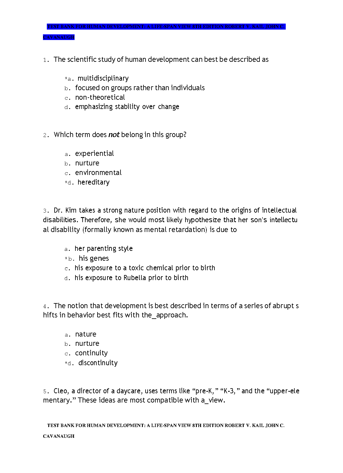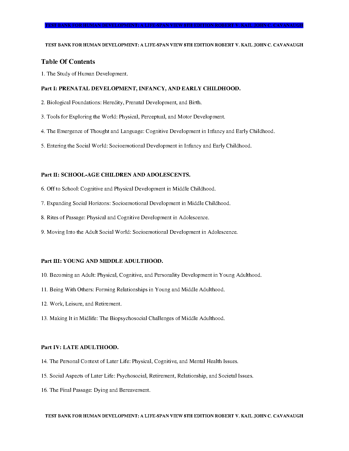 Test Bank for Human Development: A Life-Span View, 8th Edition by Robert V. Kail & John C. Cavanaugh