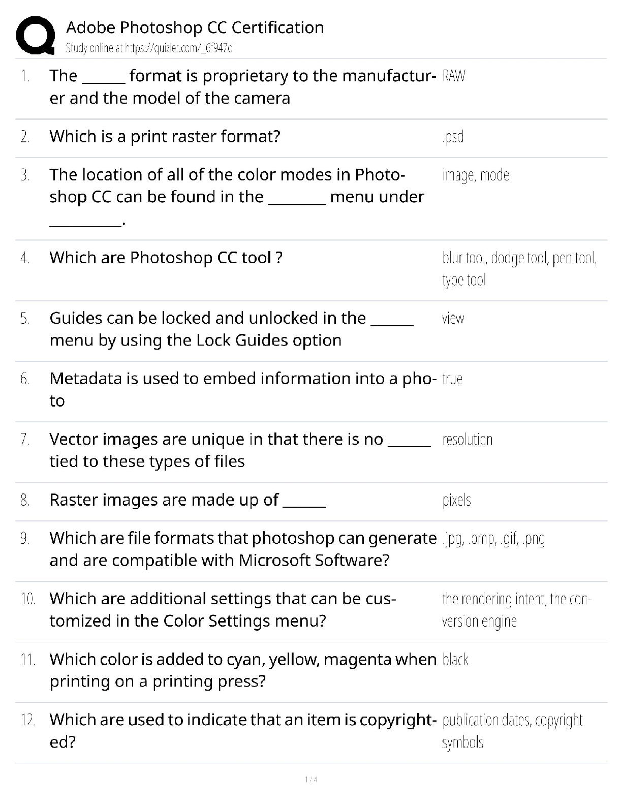 Master the essentials and ace your Adobe Photoshop CC Certification exam with our comprehensive test bank. This study guide provides a complete set of verified questions and detailed answers, covering all critical topics you'll face on the test. Explore key concepts such as file formats (RAW, PSD, JPG), color modes, essential tools, vector vs. raster image properties, metadata usage, and more. Designed to help you study efficiently and pass on your first attempt, this resource is your ultimate tool for becoming an Adobe Certified Professional.