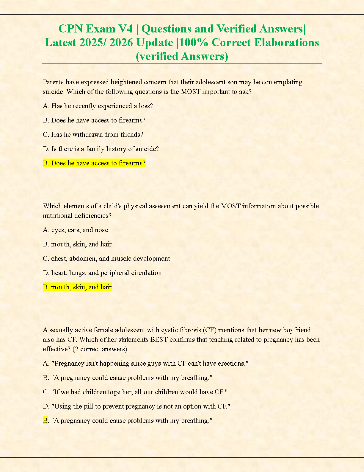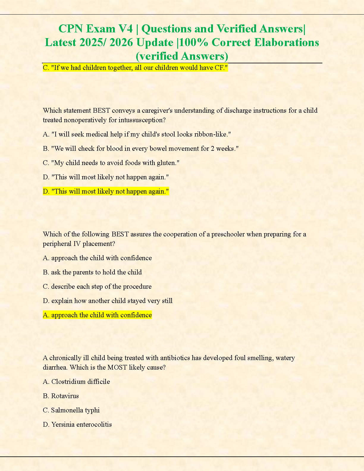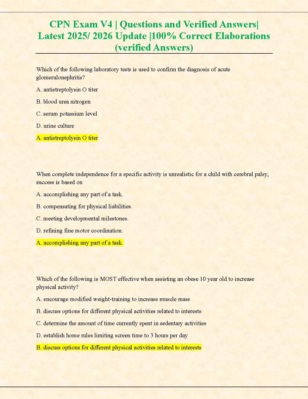 CPN Exam V4 Test Bank | Latest 2025/2026 Edition | Questions & Verified Answers for Certified Pediatric Nurse Exam Success