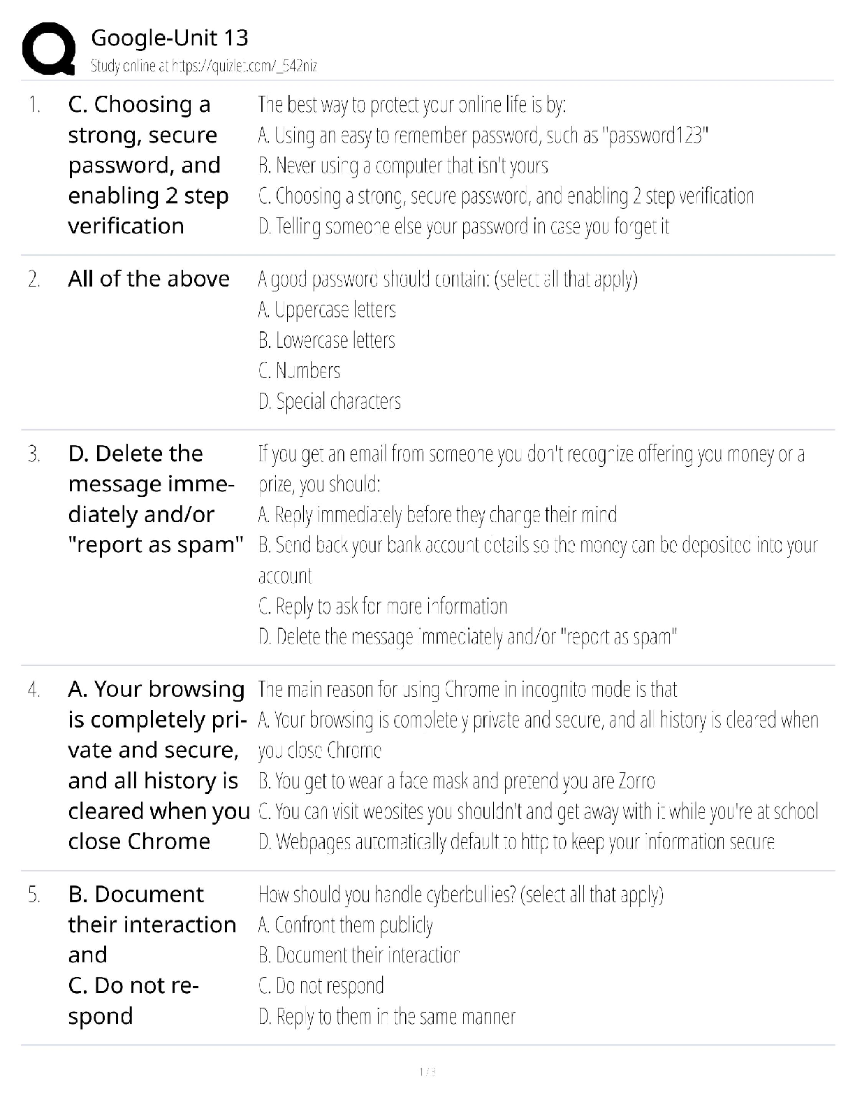Unlock success in your Google Unit 13 exam with our comprehensive test bank. This study guide features a complete set of questions with verified answers covering all essential topics in digital citizenship and online safety. Master concepts like creating strong passwords, enabling two-step verification, recognizing spam, understanding browser privacy, and handling cyberbullying. This Q&A resource is expertly designed to help you study efficiently and pass your test with confidence on your first attempt.