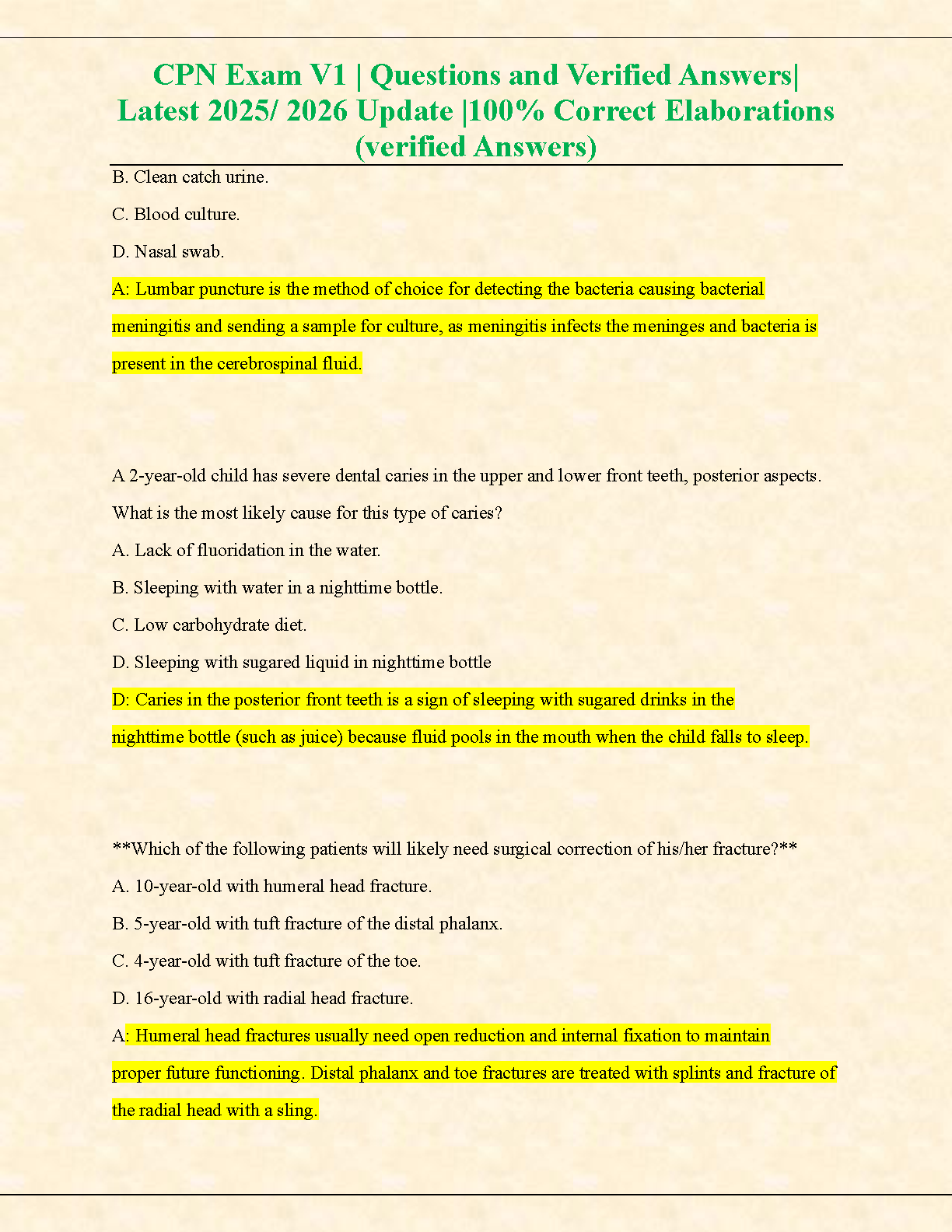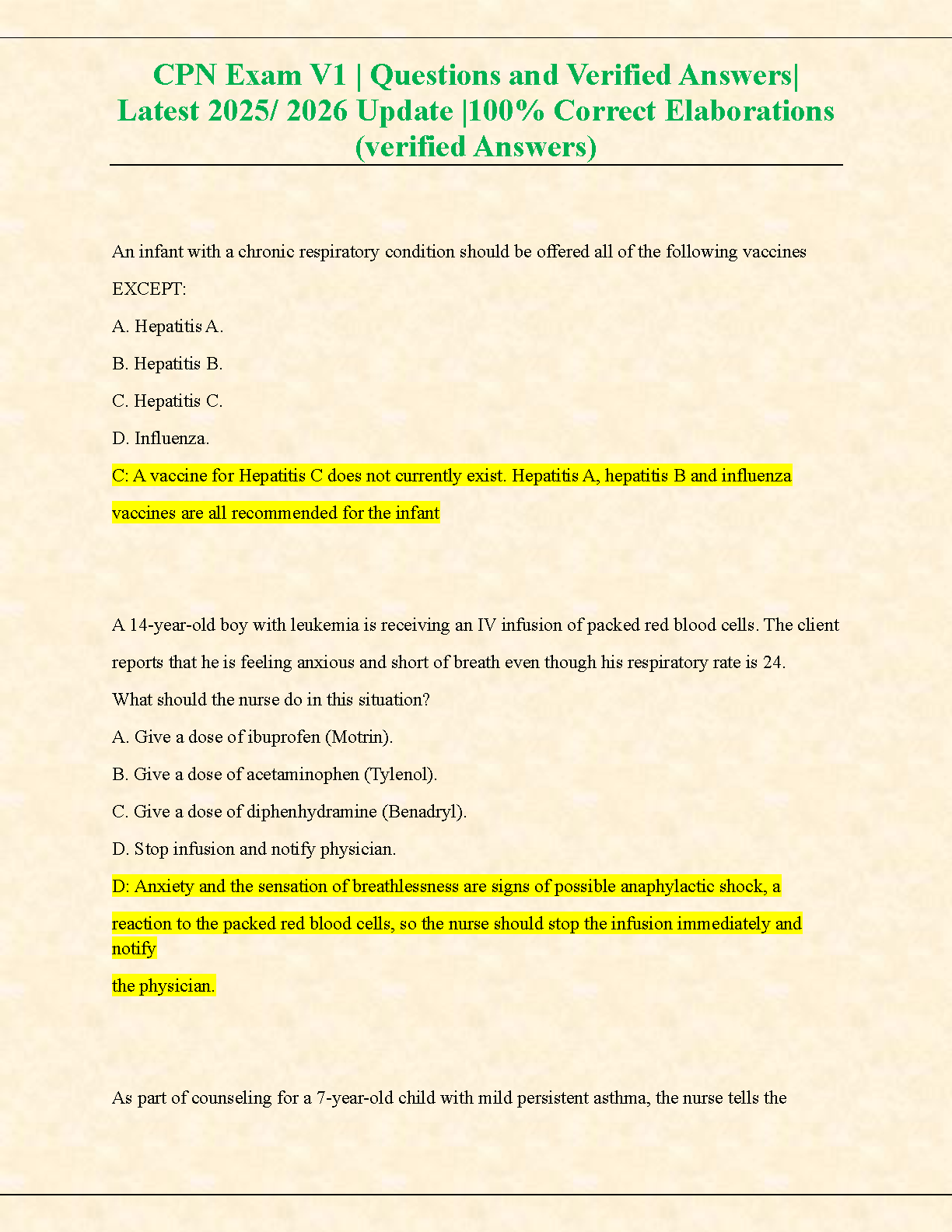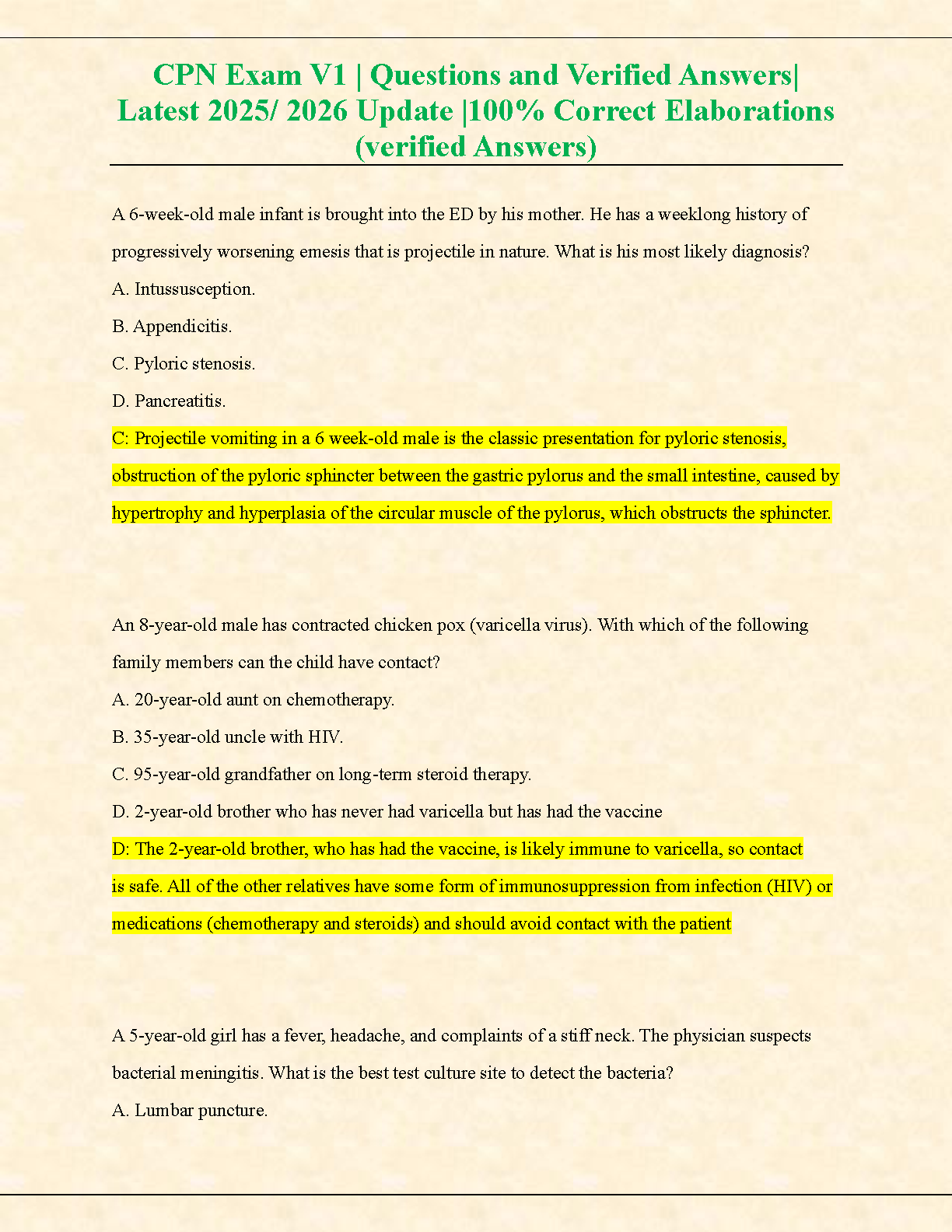 Ace your Certified Pediatric Nurse (CPN) certification with our newly updated 2025/2026 Test Bank! This essential study guide is expertly designed to guarantee your success and help you pass on the very first attempt. Inside, you'll find a comprehensive collection of exam-style questions, each accompanied by 100% correct, verified answers and in-depth elaborations. These detailed explanations break down complex pediatric nursing concepts, ensuring you not only memorize the answers but truly understand the reasoning behind them. Stop worrying about resits and start studying smarter with the ultimate resource for CPN exam preparation.