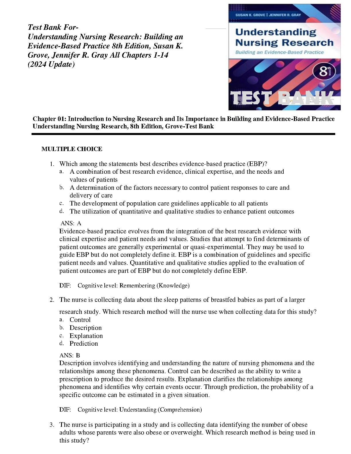 Master your nursing research course with the official 2024 updated Test Bank for 'Understanding Nursing Research: Building an Evidence-Based Practice,' 8th Edition, by renowned authors Susan K. Grove and Jennifer R. Gray. This comprehensive resource covers all 14 chapters and is packed with exam-style questions, detailed answers, and thorough rationales. It's the ultimate study tool designed to help you grasp complex concepts, test your knowledge, and ace your exams with confidence.
