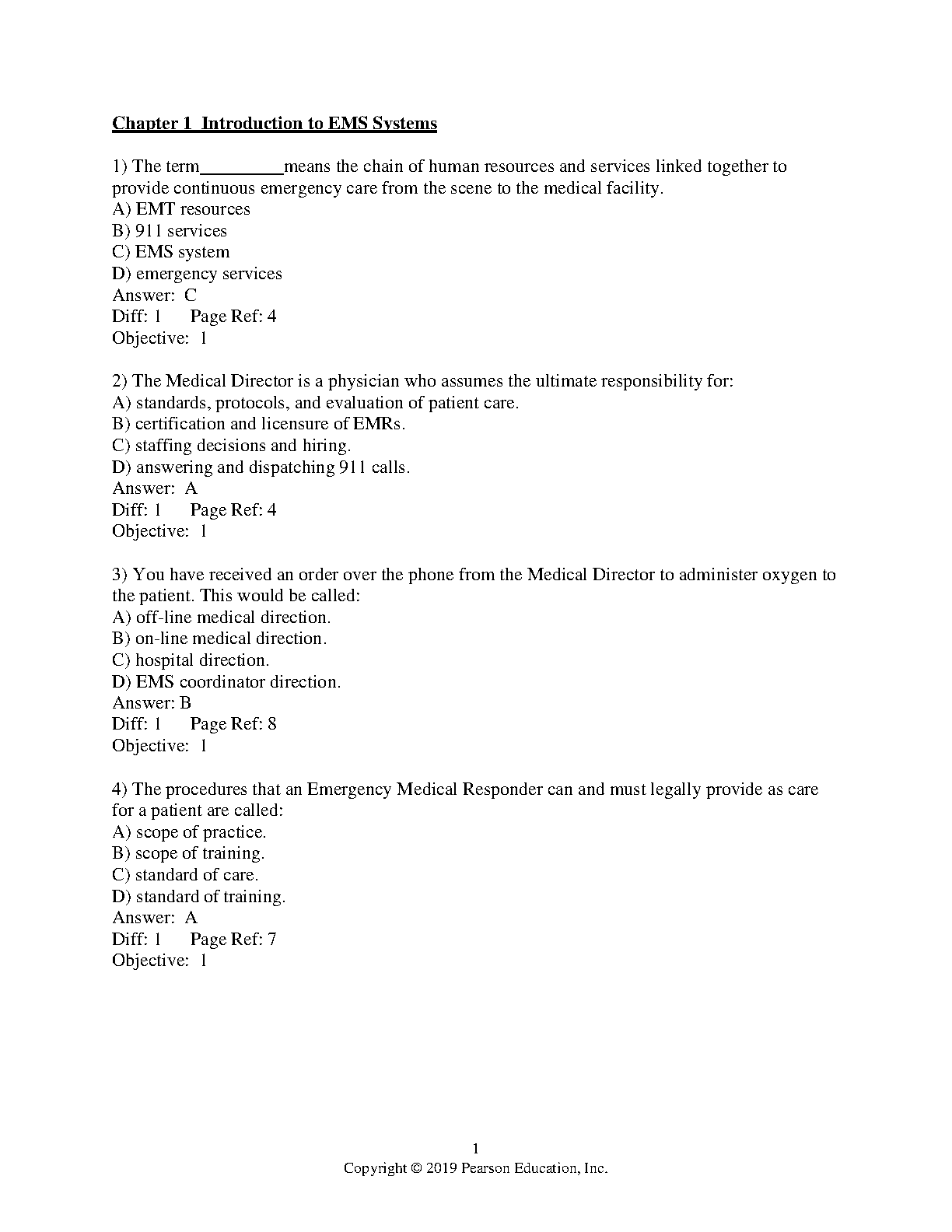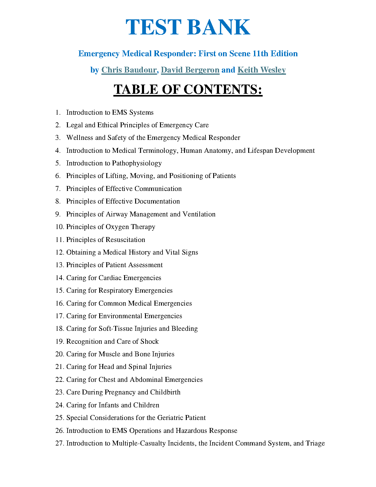 Instantly access the complete, official Test Bank for the 11th Edition of 'Emergency Medical Responder: First on the Scene' by Chris Le Baudour and J. David Bergeron. This essential study resource is packed with hundreds of exam-style questions and detailed answers, meticulously organized by chapter. It's the perfect tool for EMR students to rigorously test their knowledge, identify areas for improvement, and gain the confidence to excel in their coursework and certification exams. Master the material and pass your tests with this indispensable guide.