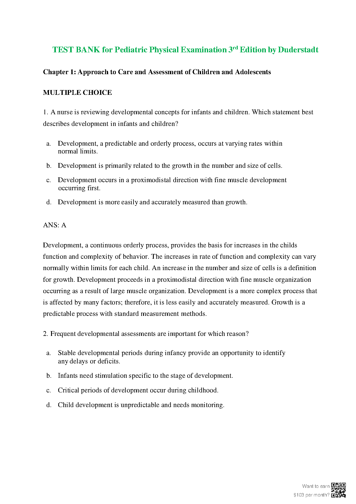 Master your pediatric nursing course with the official Test Bank for 'Pediatric Physical Examination: An Illustrated Handbook, 3rd Edition.' Authored by Duderstadt and Partsch, this comprehensive resource provides a vast collection of practice questions and detailed answers that align directly with the textbook. It is an invaluable study tool for nursing students aiming to deepen their understanding of pediatric assessment, reinforce key concepts, and excel in their examinations. Prepare effectively and boost your confidence with this essential exam preparation guide.