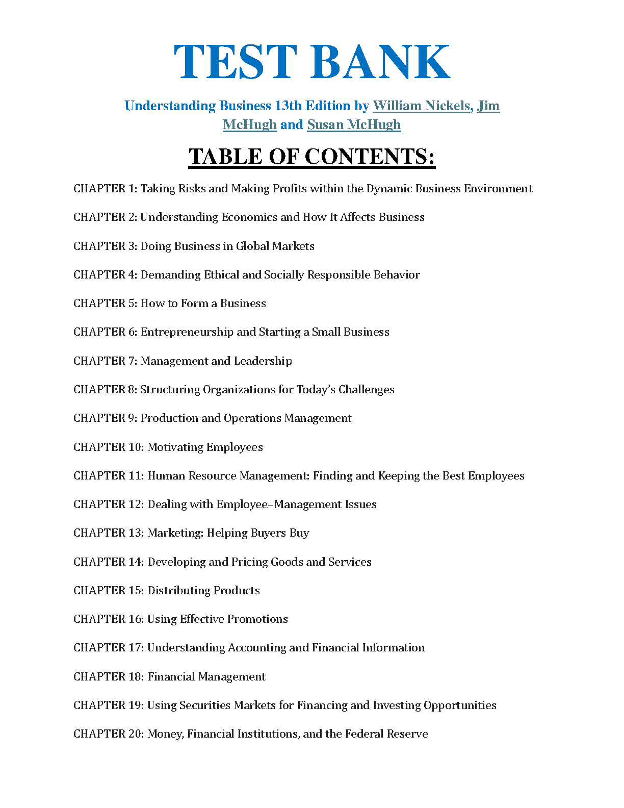 Test Bank for Understanding Business, 13th Edition by William G. Nickels, James M. McHugh, and Susan M. McHugh