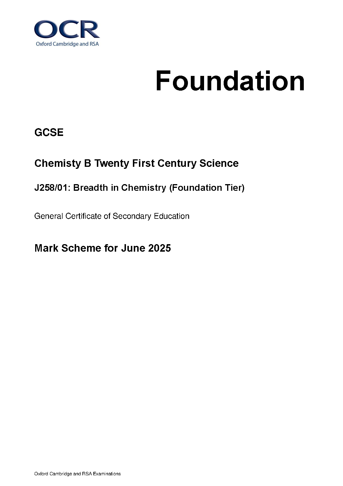 2025 OCR GCSE Chemistry B Twenty First Century Science Mark Scheme Paper 1 (J258/01: Breadth in Chemistry (Foundation Tier)