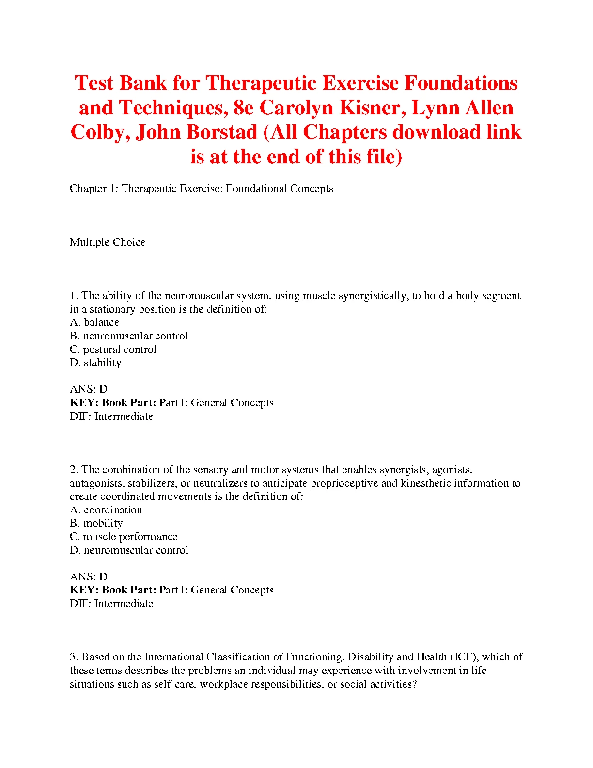 Test Bank for Therapeutic Exercise Foundations and Techniques, 8th Edition BY Carolyn Kisner, Lynn Allen Colby, John Borstad (All Chapters download link is at the end of this file)