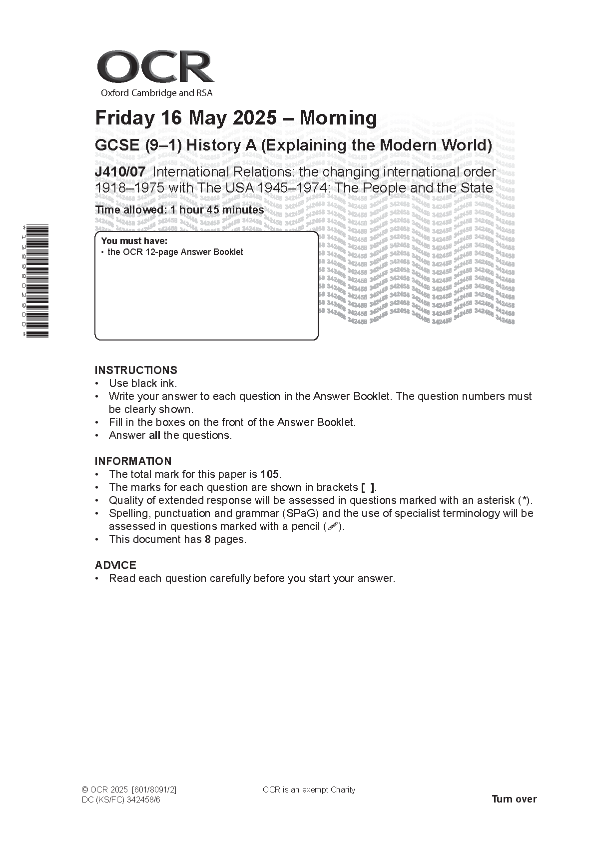 2025 OCR GCSE History A (Explaining the Modern World) Paper 7 (J410/07: The USA 1945-1974: The People and the State)
