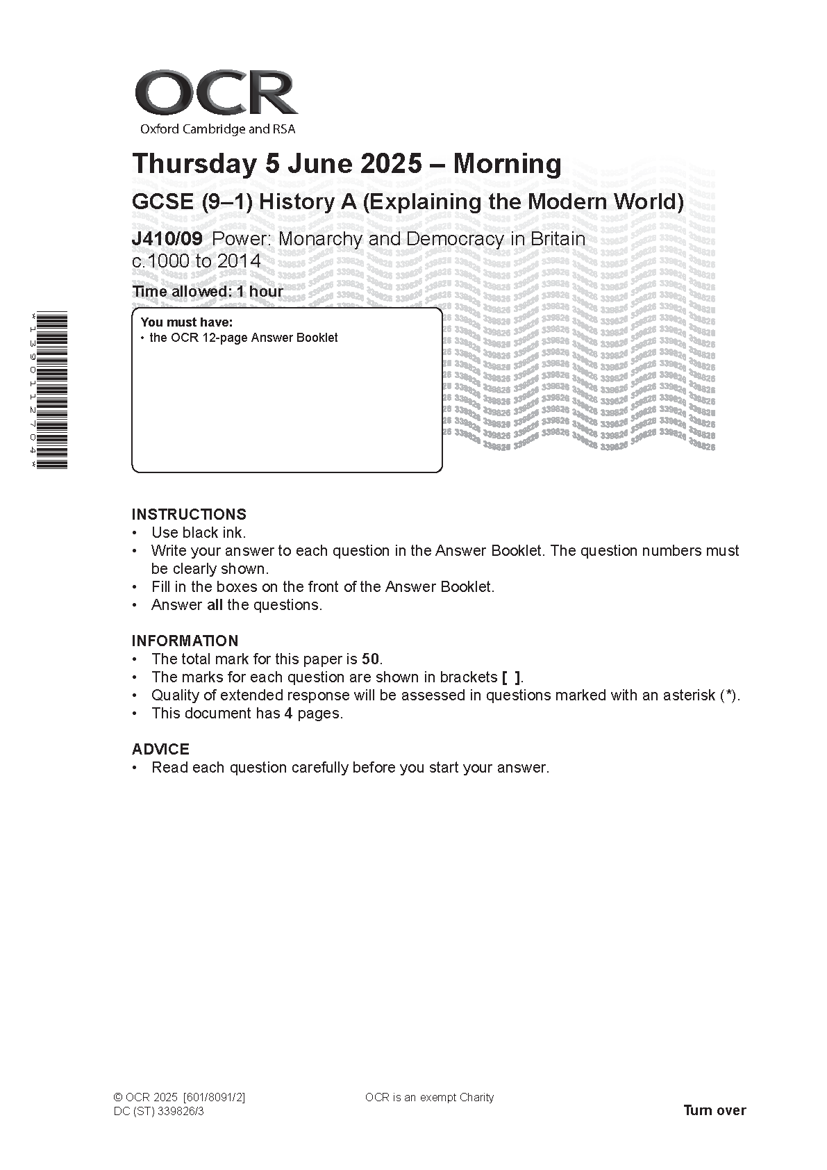 2025 OCR GCSE History A (Explaining the Modern World) Paper 9 (J410/09: Power: Monarchy and Democracy in Britain c.1000 to 2014)