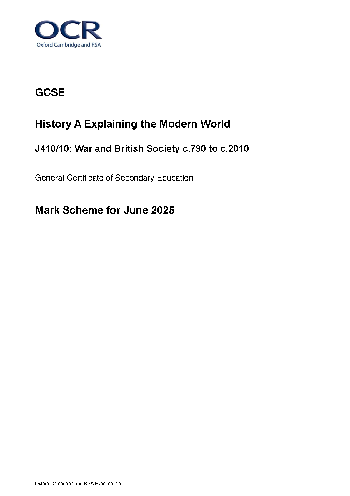 2025 OCR GCSE History A (Explaining the Modern World) Mark Scheme Paper 10 (J410/10: War and British Society c.790 to c.2010)