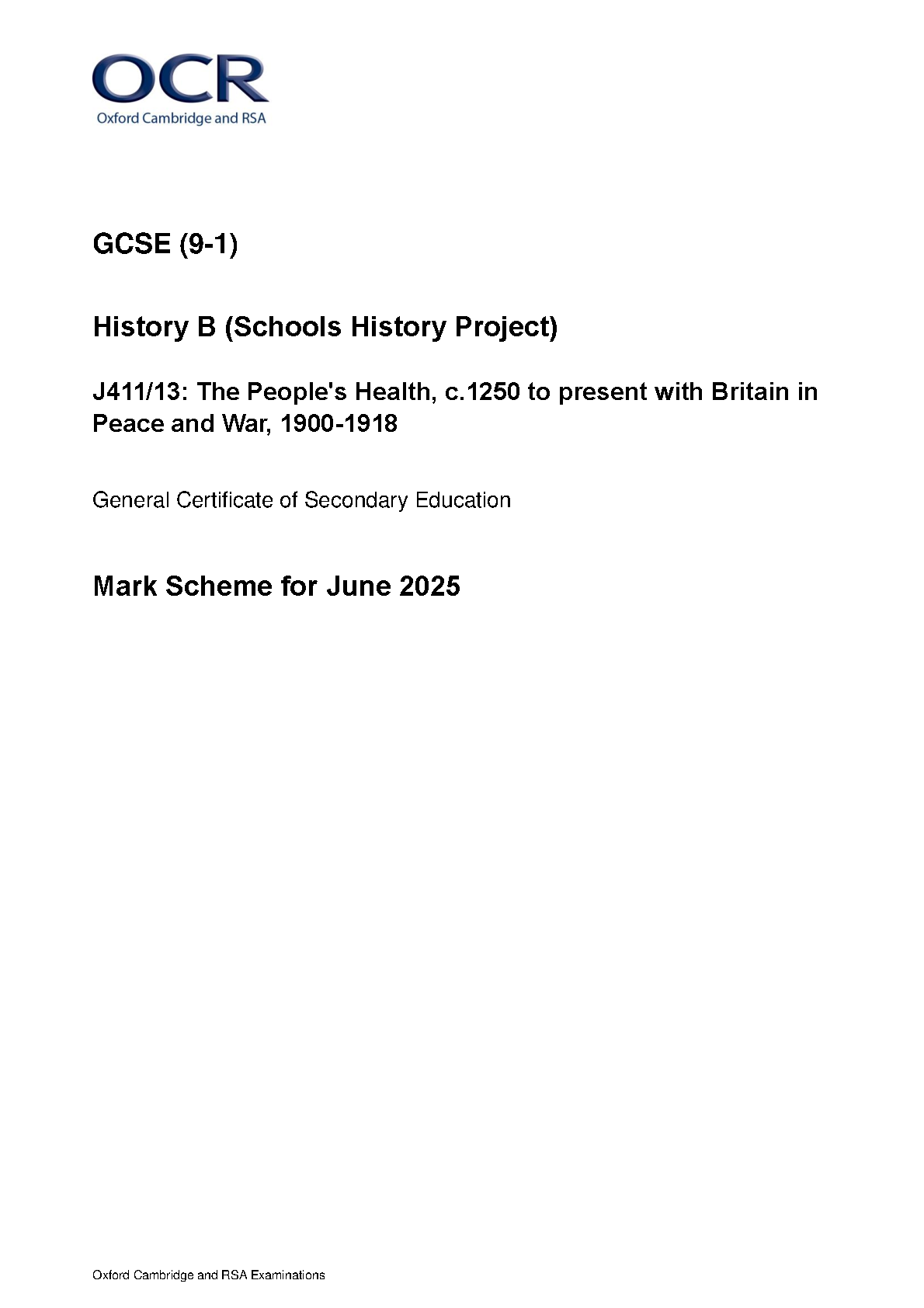 2025 OCR GCSE History B Schools History Project Mark Scheme Paper 13 (J411/13: The People's Health, c.1250 to present with Britain in Peace and War, 1900-1918)
