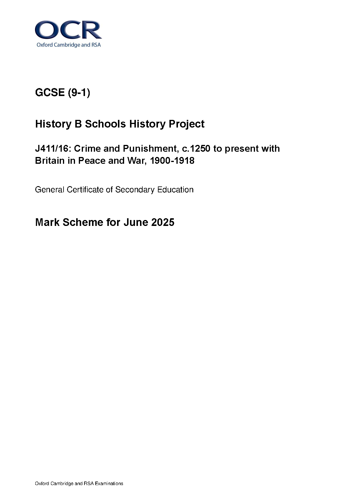 2025 OCR GCSE History B Schools History Project Mark Scheme Paper 16 (J411/16: Crime and Punishment, c.1250 to present with Britain in Peace and War, 1900–1918)