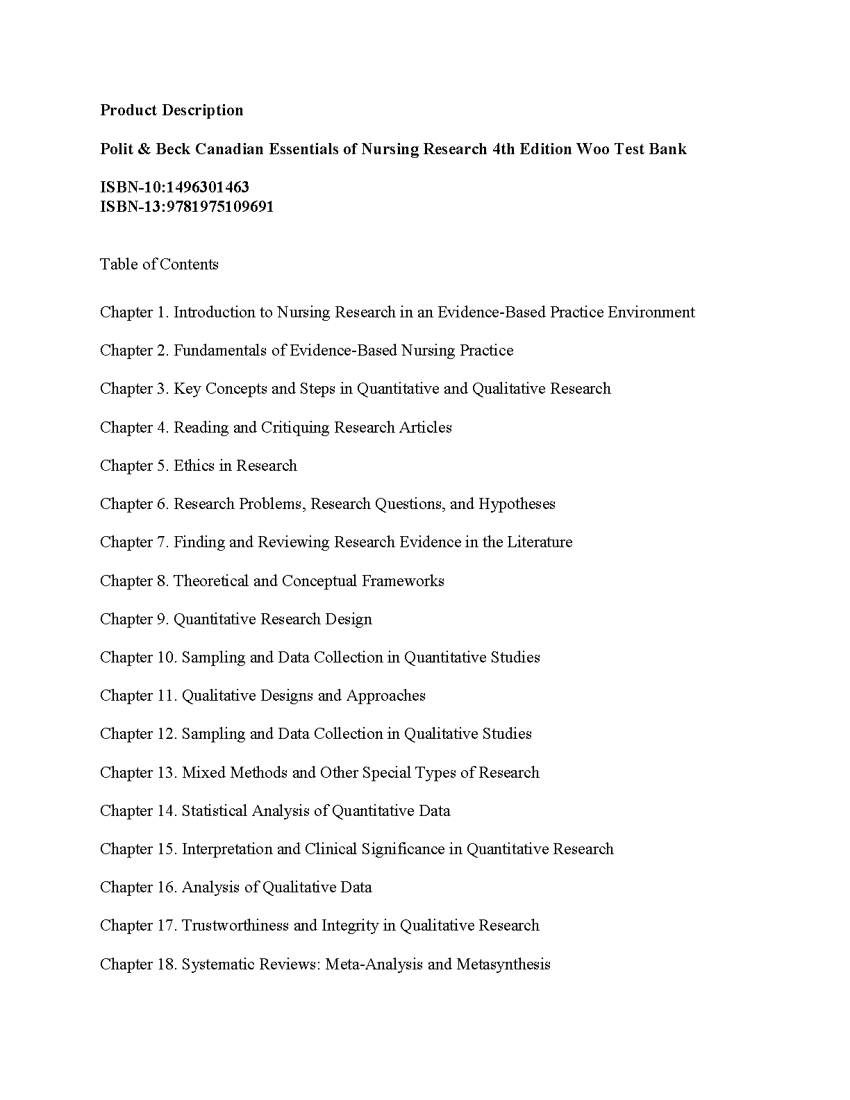 Test Bank for Canadian Essentials of Nursing Research, 4th Canadian Edition by Denise F. Polit, Cheryl Tatano Beck, and Dawn Bazett-Jones