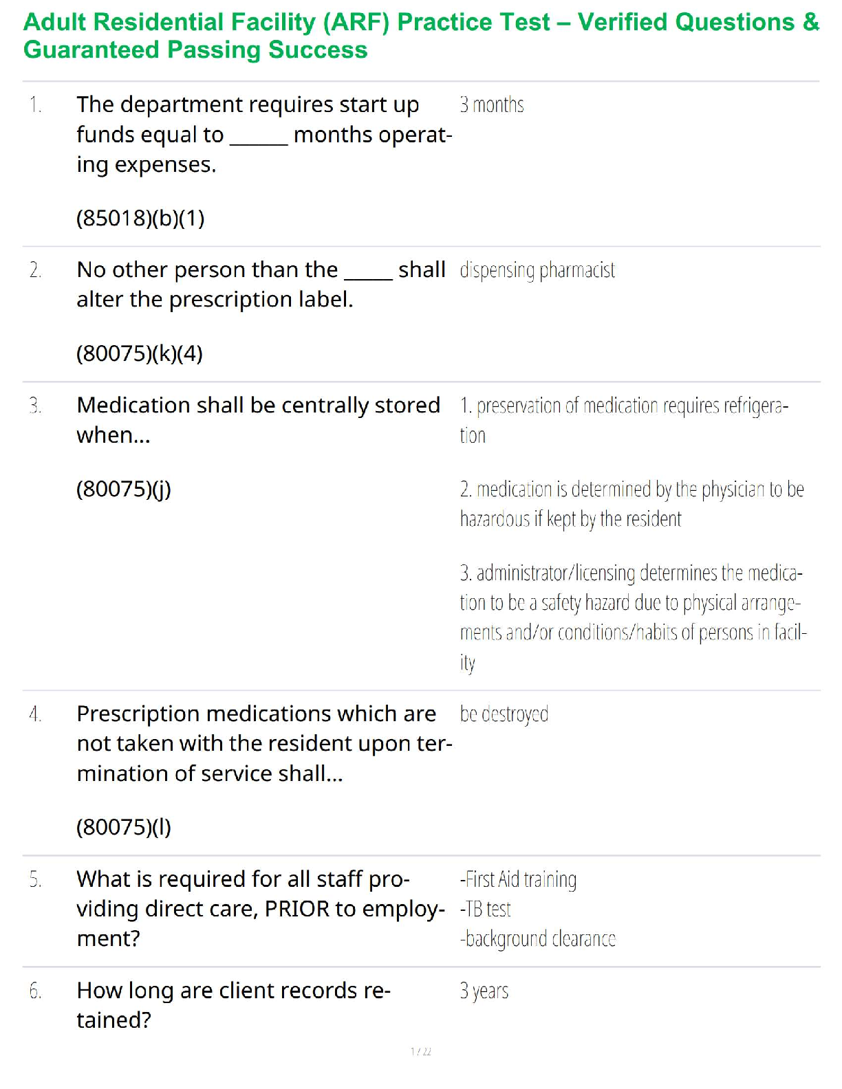 Master the Adult Residential Facility (ARF) Administrator certification exam with our complete test bank. This essential study resource features an extensive collection of verified questions and accurate answers, mirroring the format and content of the actual ARF exam. Dive deep into crucial topics such as start-up funds, medication management, staffing requirements, and resident record-keeping. Designed to ensure you pass on your first attempt, this practice test is the ultimate tool for achieving your ARF certification and launching your career with confidence.
