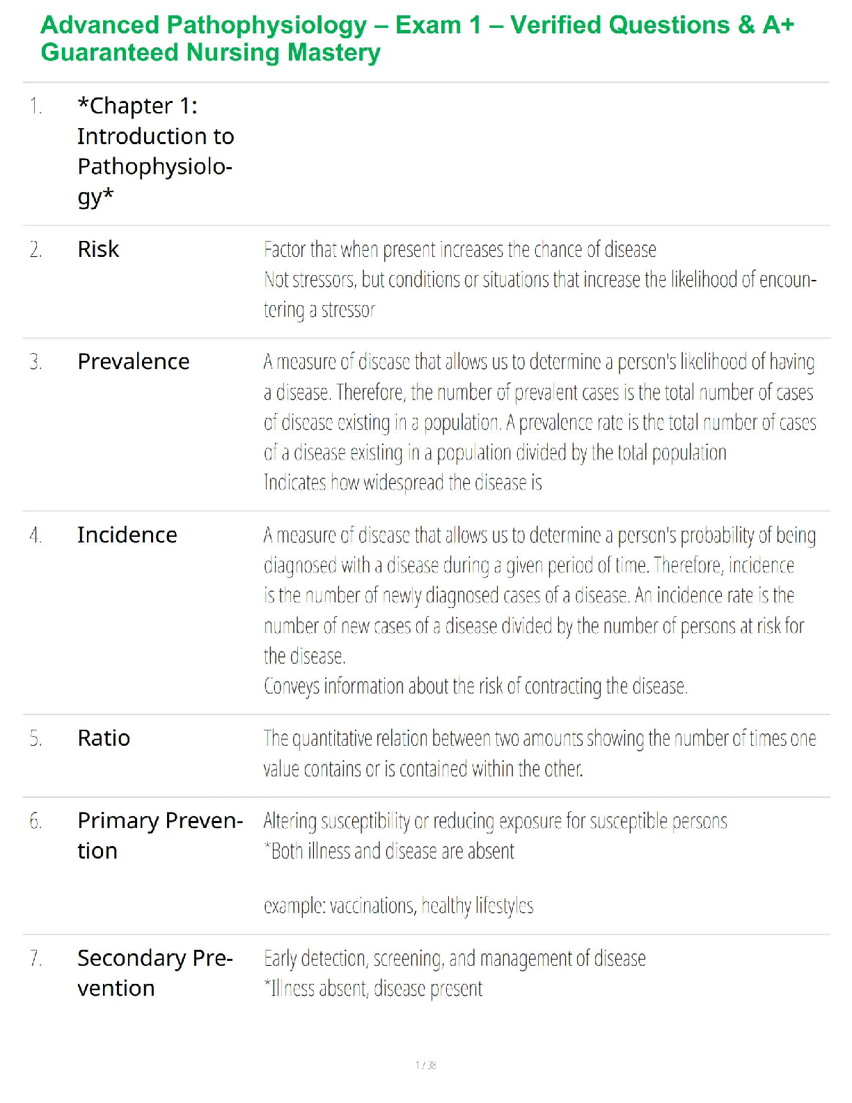Unlock A+ results in your Advanced Pathophysiology course with this comprehensive test bank for Exam 1. This verified resource, aligned with 'Pathophysiology: The Biologic Basis for Disease in Adults and Children, 8th Edition' by Kathryn L. McCance and Sue E. Huether, provides a complete set of questions and detailed answers covering fundamental concepts from Chapter 1. Master key terms like incidence, prevalence, and prevention to build a strong foundation. This study guide is expertly designed to help nursing students ace their first exam, ensure mastery of the material, and achieve academic success with confidence.