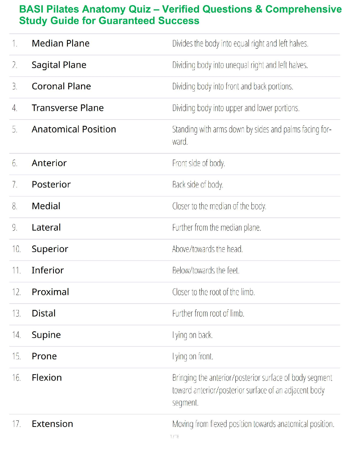 Ace your BASI Pilates Anatomy certification with our comprehensive test bank! This study guide features a complete set of verified questions and detailed answers covering all essential topics, from anatomical planes (Median, Sagittal, Coronal) and directional terms (Anterior, Posterior, Proximal, Distal) to core movements like Flexion and Extension. Aligned with the authoritative text "Pilates Anatomy, 2nd Edition" by Rael Isacowitz and Karen Clippinger, this resource is your key to mastering the material and passing your exam with confidence on the first try.