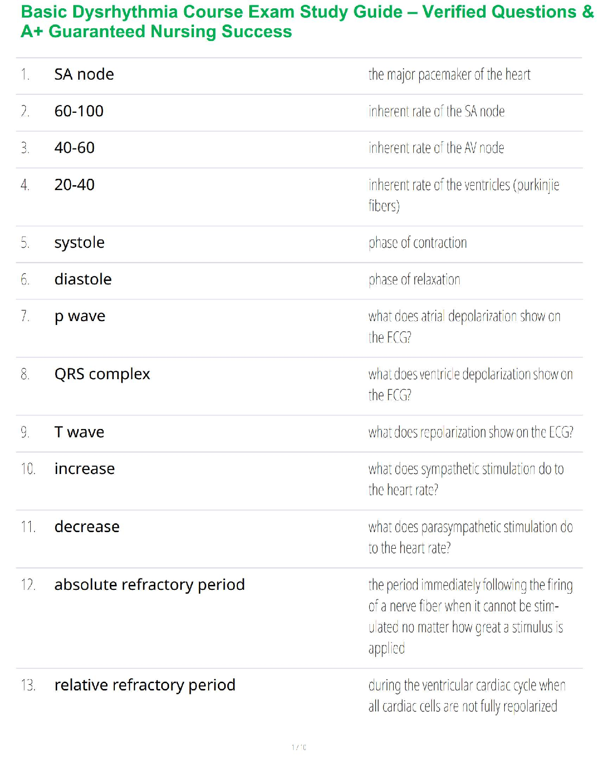 Unlock A+ results on your Relias Basic Dysrhythmia exam with our comprehensive 2025/2026 study guide. This essential resource is packed with verified questions and detailed answers covering all critical topics, including the heart's electrical conduction system (SA node, AV node), ECG interpretation (P wave, QRS complex, T wave), and key cardiac physiology concepts like systole and diastole. Designed specifically for nursing students and healthcare professionals, this guide simplifies complex information to ensure you grasp the fundamentals and pass your certification on the first attempt. Avoid resits and build your confidence with this proven tool for nursing success.