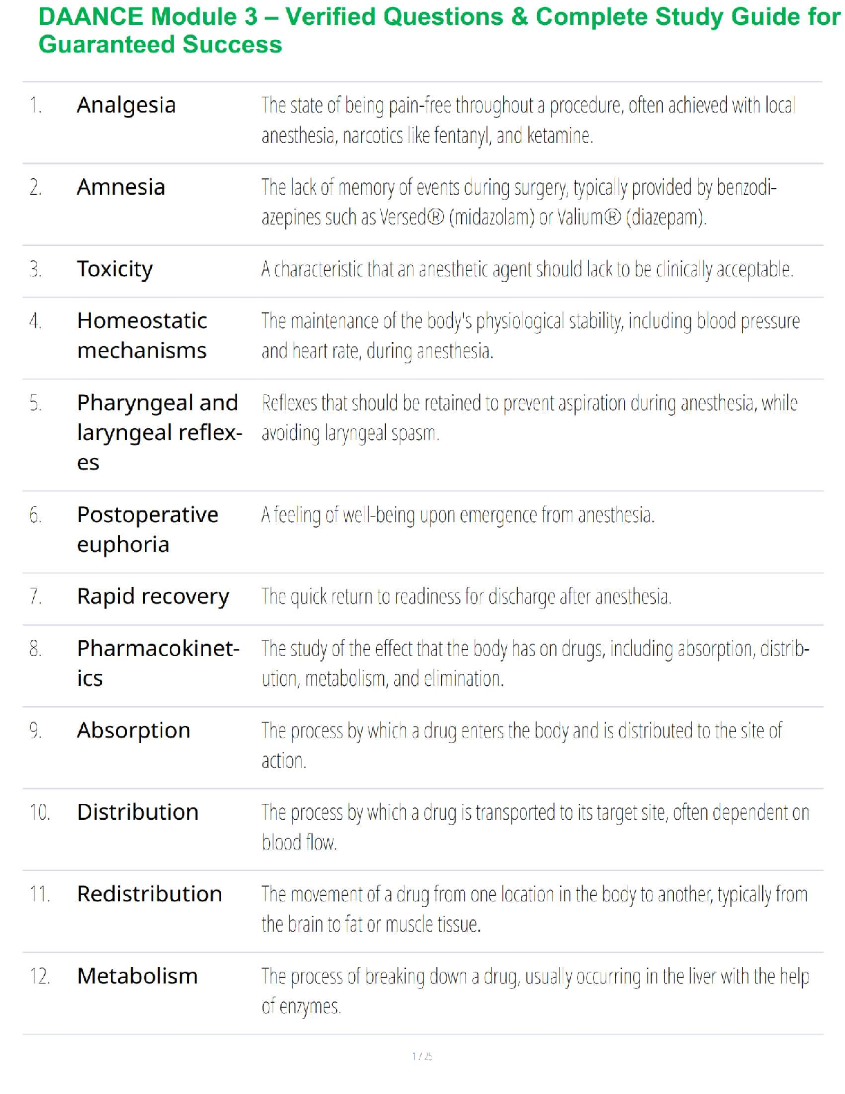 Get ready to ace your Dental Anesthesia Assistant National Certification Examination (DAANCE) with our comprehensive study guide for Module 3. This resource is packed with verified questions and detailed answers covering all essential topics, from analgesia and amnesia to pharmacokinetics. Designed for the 2025/2026 academic year, this complete guide is your key to understanding the core concepts and passing the exam on your first attempt. Avoid resits and achieve guaranteed success with our expertly crafted materials.