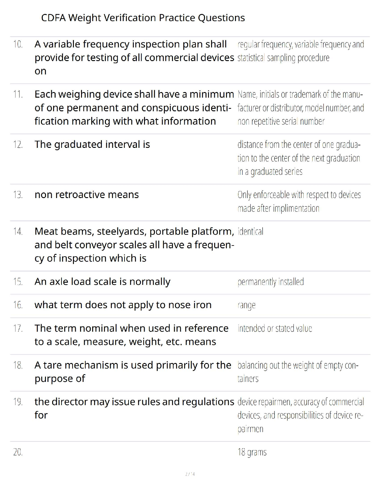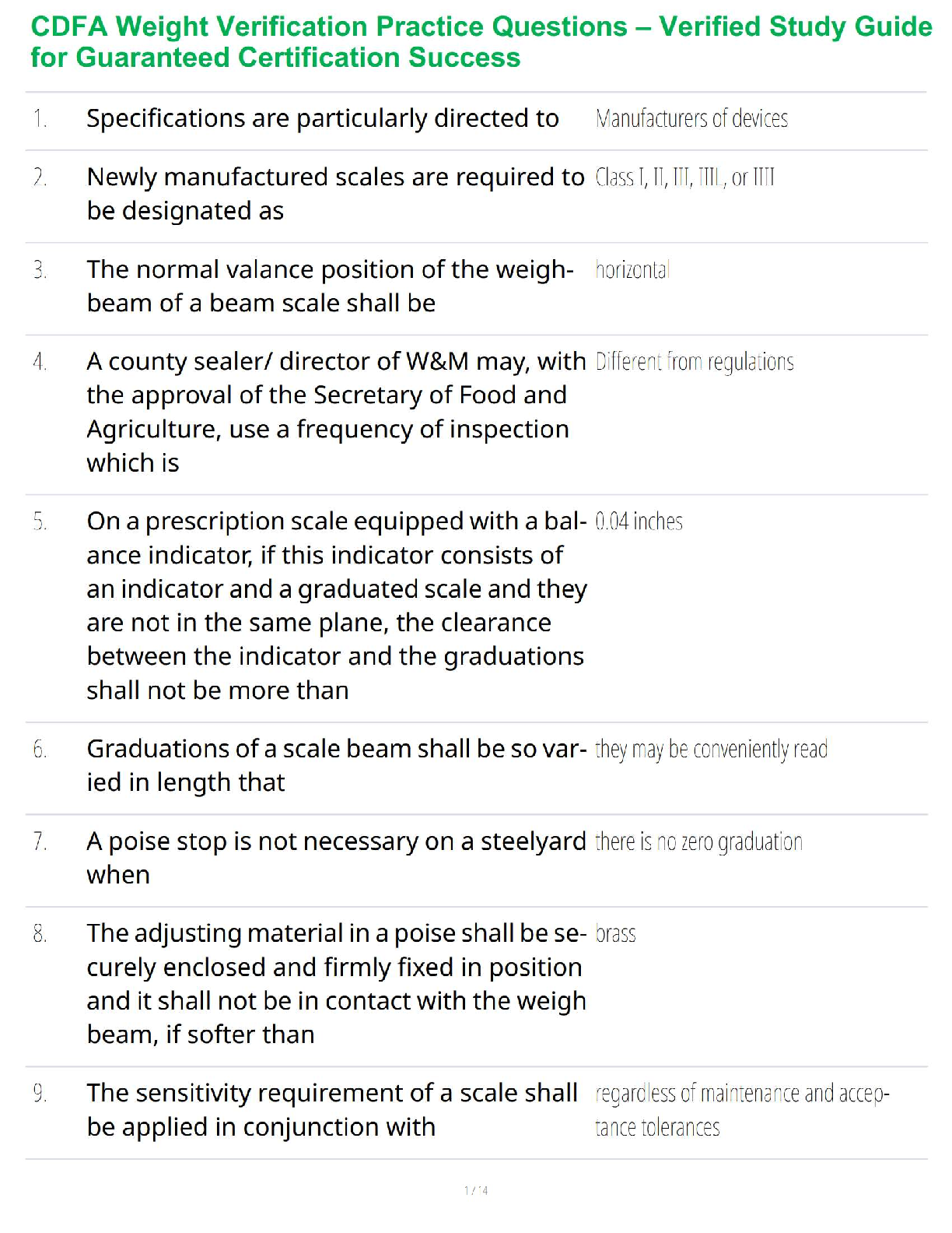Unlock guaranteed success in your CDFA Weight Verification Certification exam with our premier test bank. This resource is meticulously compiled with the latest, verified practice questions and answers, mirroring the actual exam format. Master key concepts related to weights and measures, device specifications, and regulatory standards. Our study guide is expertly designed to help you pass confidently on your first attempt, saving you time and the stress of a resit. Get instant access and start preparing for your certification today!