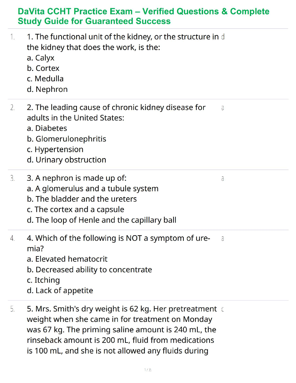 Ace your Certified Clinical Hemodialysis Technician (CCHT) certification with our comprehensive DaVita CCHT Test Bank. This essential study resource features a collection of verified practice exam questions, complete with detailed answers, designed to mirror the actual test format. Master key concepts in renal care, including kidney anatomy, chronic kidney disease, dialysis procedures, and patient calculations. Our CCHT study guide is your ultimate tool for effective preparation, boosting your confidence and ensuring you pass your exam on the first attempt. Download now to start your journey towards becoming a certified hemodialysis technician.