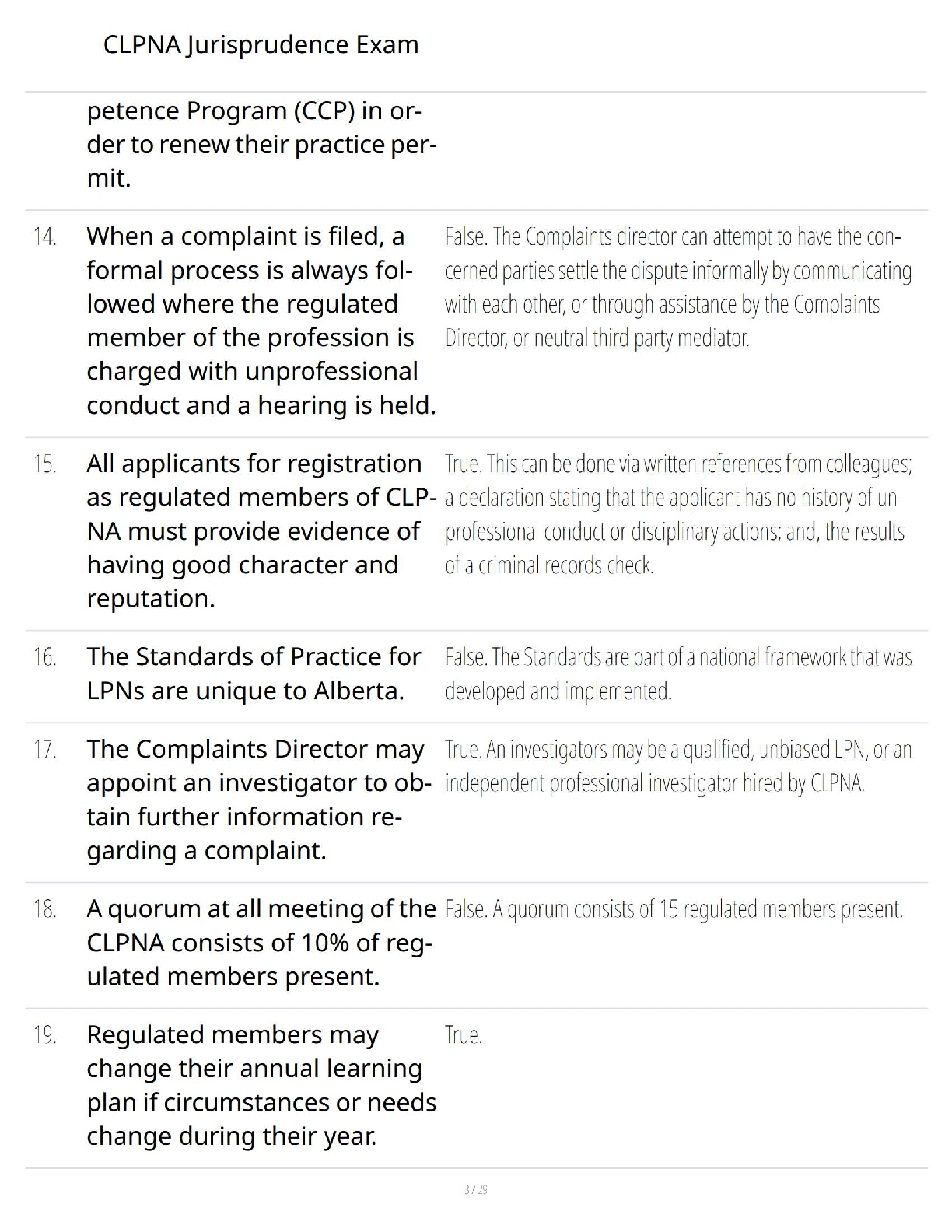 Achieve licensing success on your first attempt with our comprehensive test bank for the CLPNA Jurisprudence Exam. This essential study resource provides a complete set of verified questions, each paired with a correct answer and a detailed rationale. Master the core principles of nursing jurisprudence in Alberta, including the Health Professions Act, LPN regulations, ethical codes, and professional standards. Our meticulously prepared guide is designed to give you the confidence and knowledge needed to pass the exam, ensuring you are fully prepared for a successful career as a Licensed Practical Nurse in Alberta.