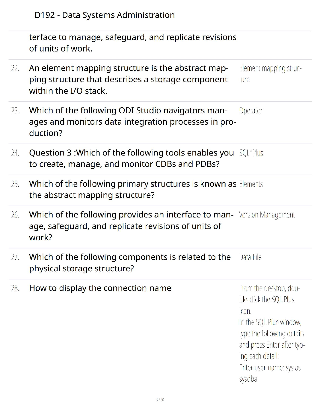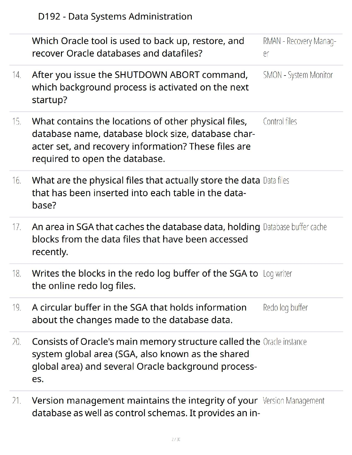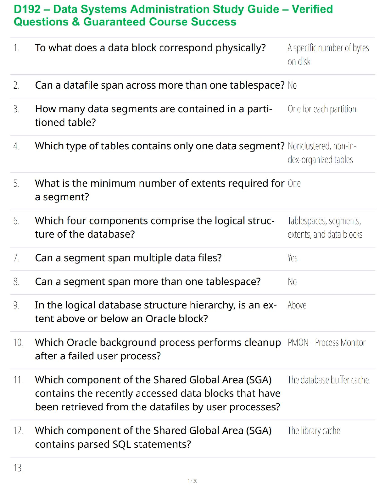Unlock success in your WGU D192 Data Systems Administration course with this comprehensive test bank. It's packed with the latest verified exam questions and precise answers, covering essential topics like database structures, Oracle processes, and the SGA. This study guide is expertly designed to help you grasp key concepts quickly, boost your confidence, and pass your final exam on the first attempt. Get the grade you deserve and avoid resits with this essential D192 resource.