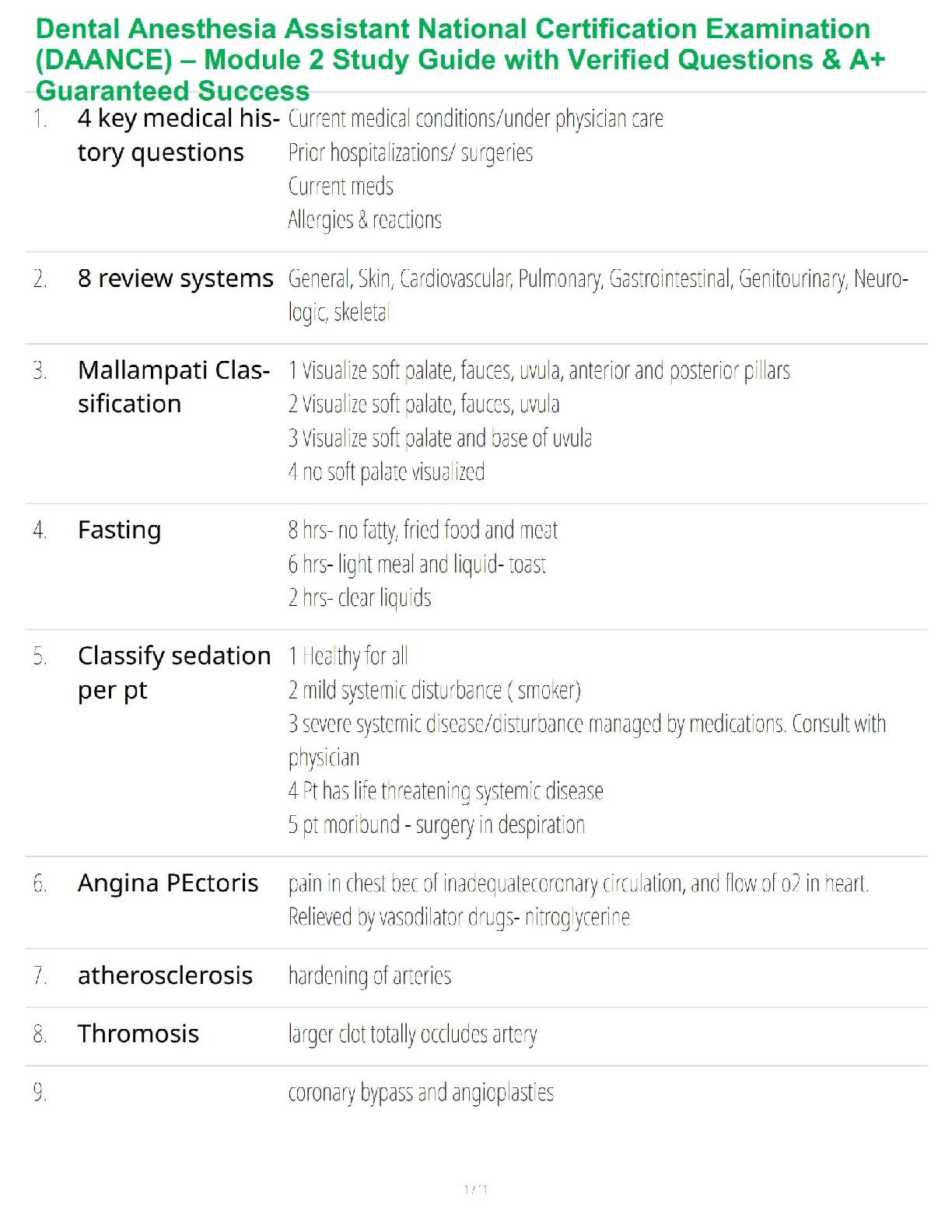 Prepare to excel in your Dental Anesthesia Assistant National Certification Examination (DAANCE) with our comprehensive study guide for Module 2. This updated resource for the 2025/2026 academic year is expertly designed to guarantee your success. It features a complete set of verified questions and detailed, A+ graded answers covering all essential topics. Dive deep into crucial areas such as patient assessment, medical history, review of systems, Mallampati classification, fasting protocols, sedation classification, and key cardiovascular concepts. This is the ultimate tool to help you master the material, pass your DAANCE exam on the first attempt, and avoid costly resits.