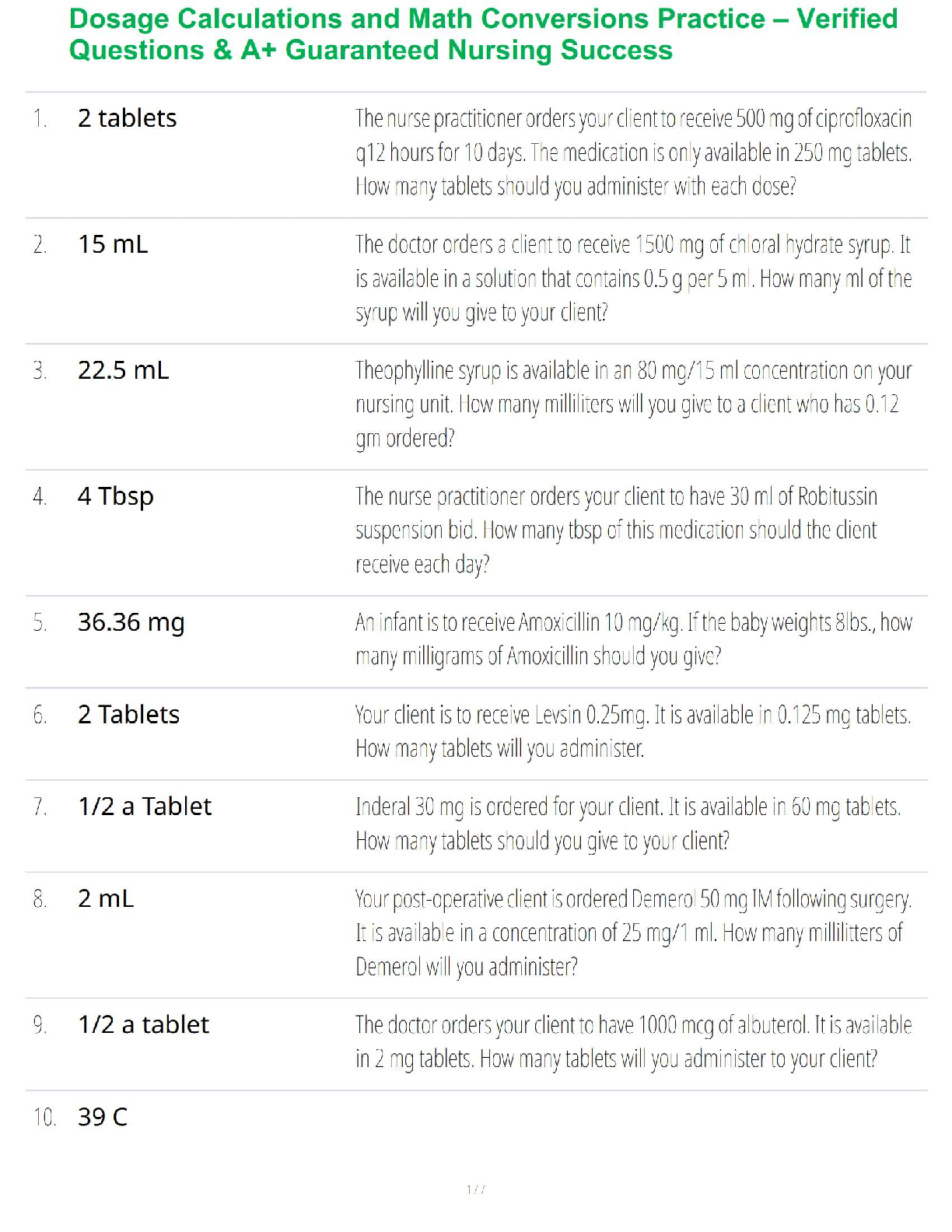Ace your nursing pharmacology and dosage calculation exams with our latest 2025/2026 practice test bank. This essential study guide features a comprehensive set of verified questions and detailed, step-by-step answers covering all critical math conversions and dosage calculations you'll encounter in your exams and clinical practice. Designed to help you master complex problems, from tablets and syrups to weight-based calculations, this resource is your key to achieving an A+ and passing demanding nursing exams like the NCLEX, HESI, and ATI on your very first attempt. Avoid resits and build the confidence you need for guaranteed nursing success.