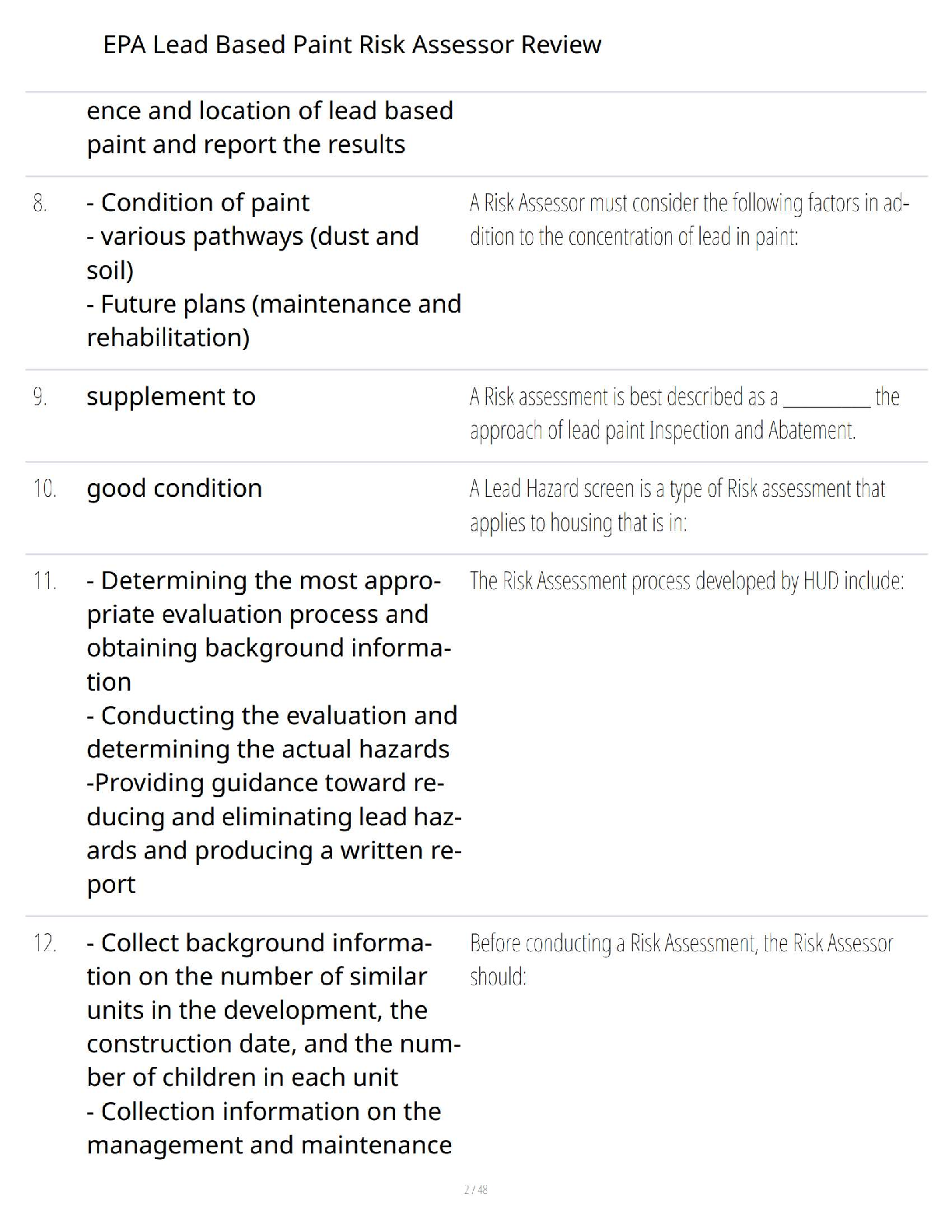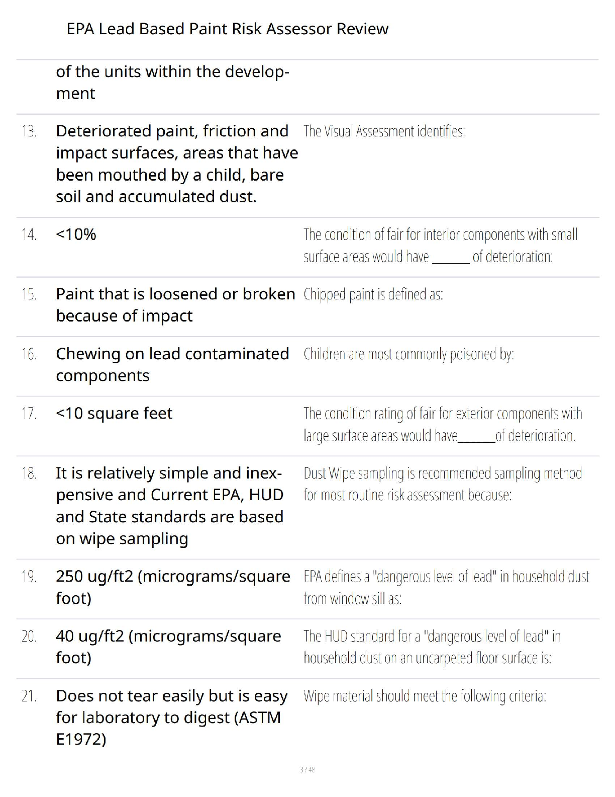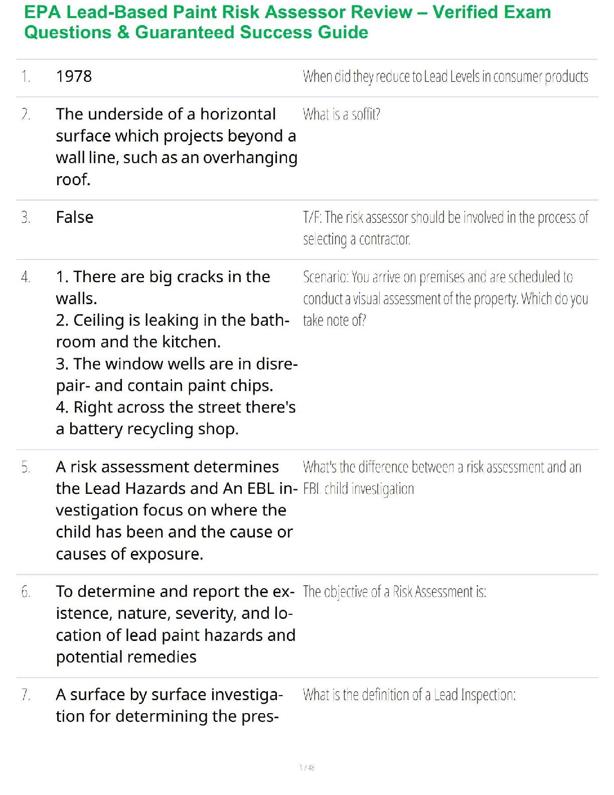 Ace your EPA Lead-Based Paint Risk Assessor certification exam with our comprehensive test bank. This guide is packed with verified exam questions and detailed answers, covering all essential topics you'll face. From identifying lead hazards to understanding the full scope of a risk assessment, our resource is designed to give you the confidence and knowledge needed to pass on your very first attempt. Stop worrying about resits and start your journey to becoming a certified risk assessor today with this essential study tool.