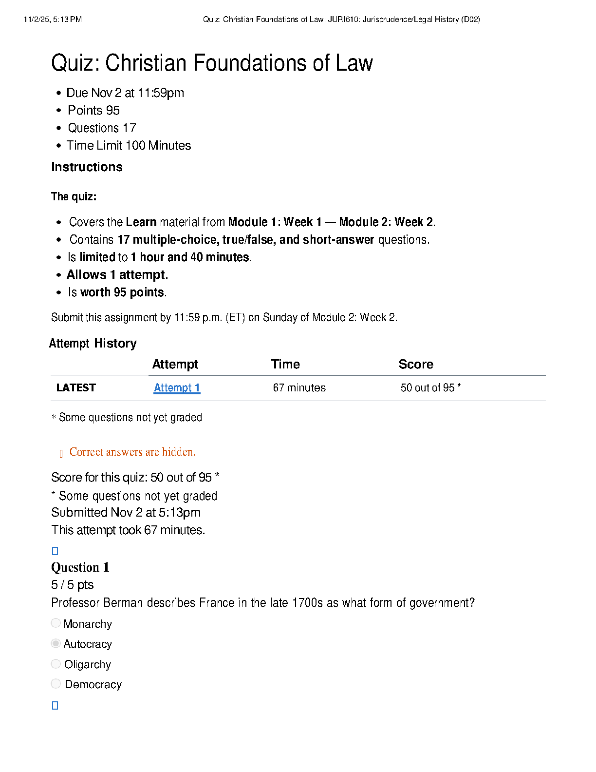 Instantly access the essential study material for your JURI610 Jurisprudence and Legal History course. This test bank focuses on the 'Christian Foundations of Law' quiz, covering key topics from Module 1 and Module 2. Inside, you will find 17 practice questions structured in multiple-choice, true/false, and short-answer formats, just like the real quiz. Valued at 95 points, this guide is your key to understanding complex legal history concepts influenced by Christian thought, as taught by scholars like Harold J. Berman. Prepare effectively, boost your confidence, and aim for a top score on your exam.