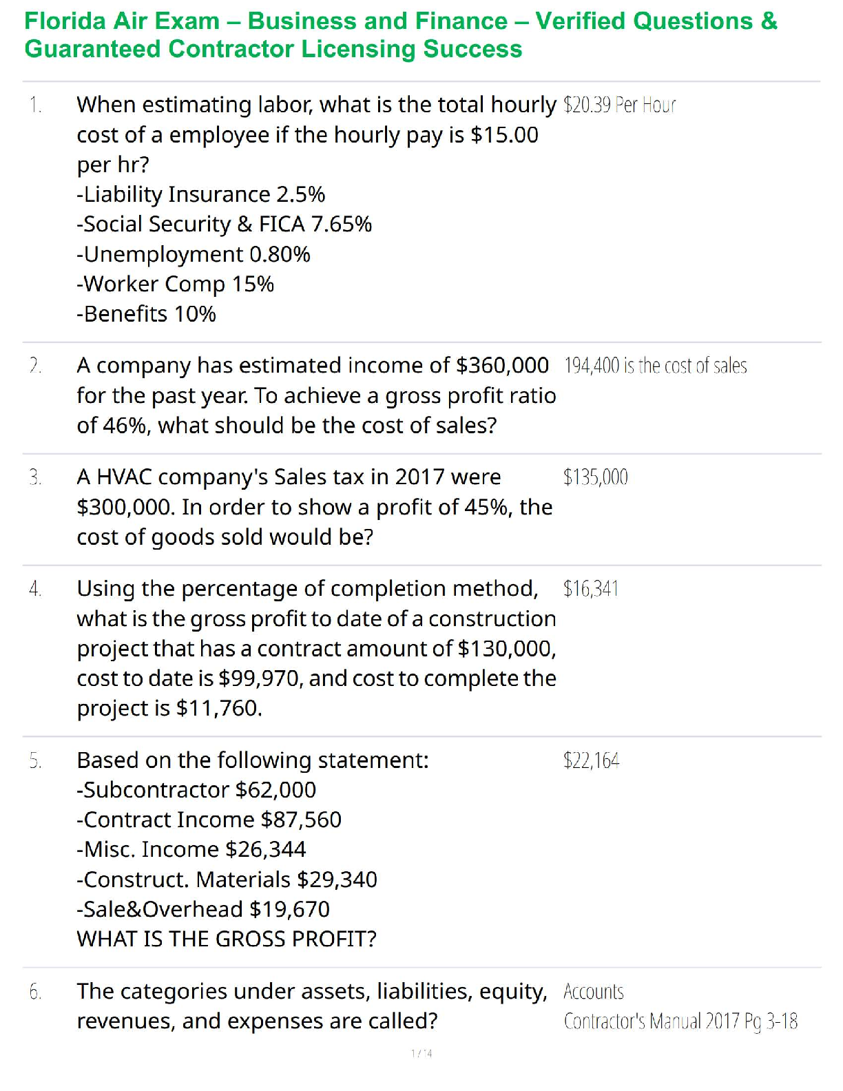 Ace your Florida Air Contractor licensing exam with our exclusive Business and Finance Test Bank. This comprehensive resource is packed with verified questions and detailed, accurate answers designed to mirror the actual exam format. Master crucial topics such as estimating labor costs, calculating gross profit, understanding the percentage of completion method, and fundamental accounting principles. Our study guide is your key to building confidence, avoiding costly resits, and achieving guaranteed success on your first attempt. Get instant access and start preparing to pass today!