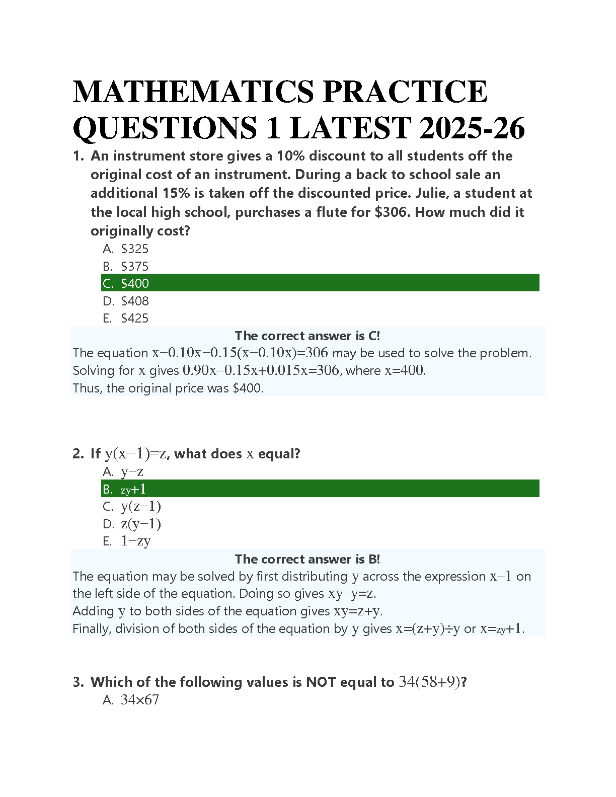 Ace your mathematics exams with our latest 2025-2026 edition of the Mathematics Practice Questions 1 Test Bank. This comprehensive resource provides a wide range of practice questions, each accompanied by a detailed, step-by-step solution and explanation. Designed to help you master key mathematical concepts from algebra to word problems, this guide is your ultimate tool for effective exam preparation. Boost your confidence and ensure you pass your exams on the first attempt!